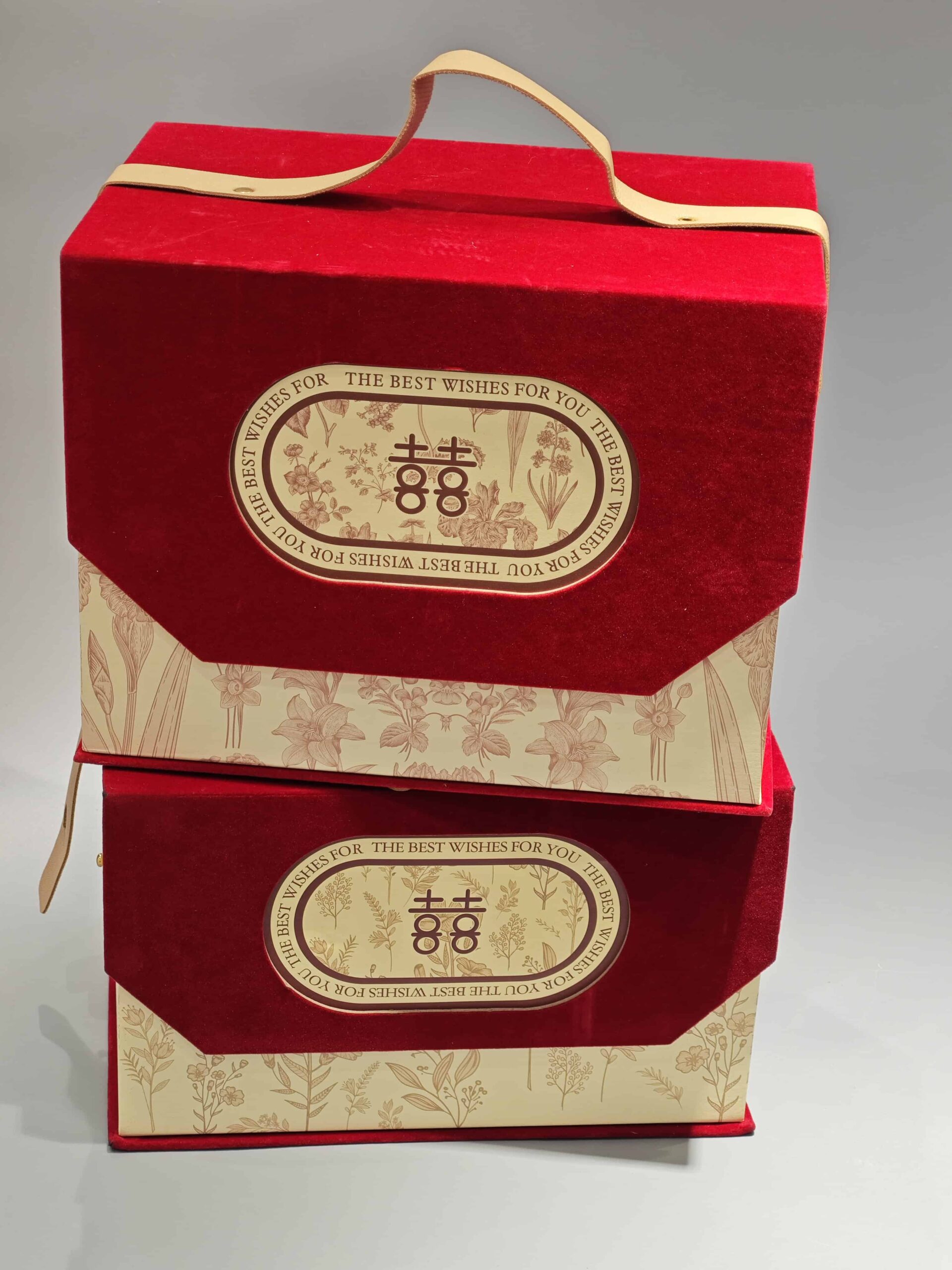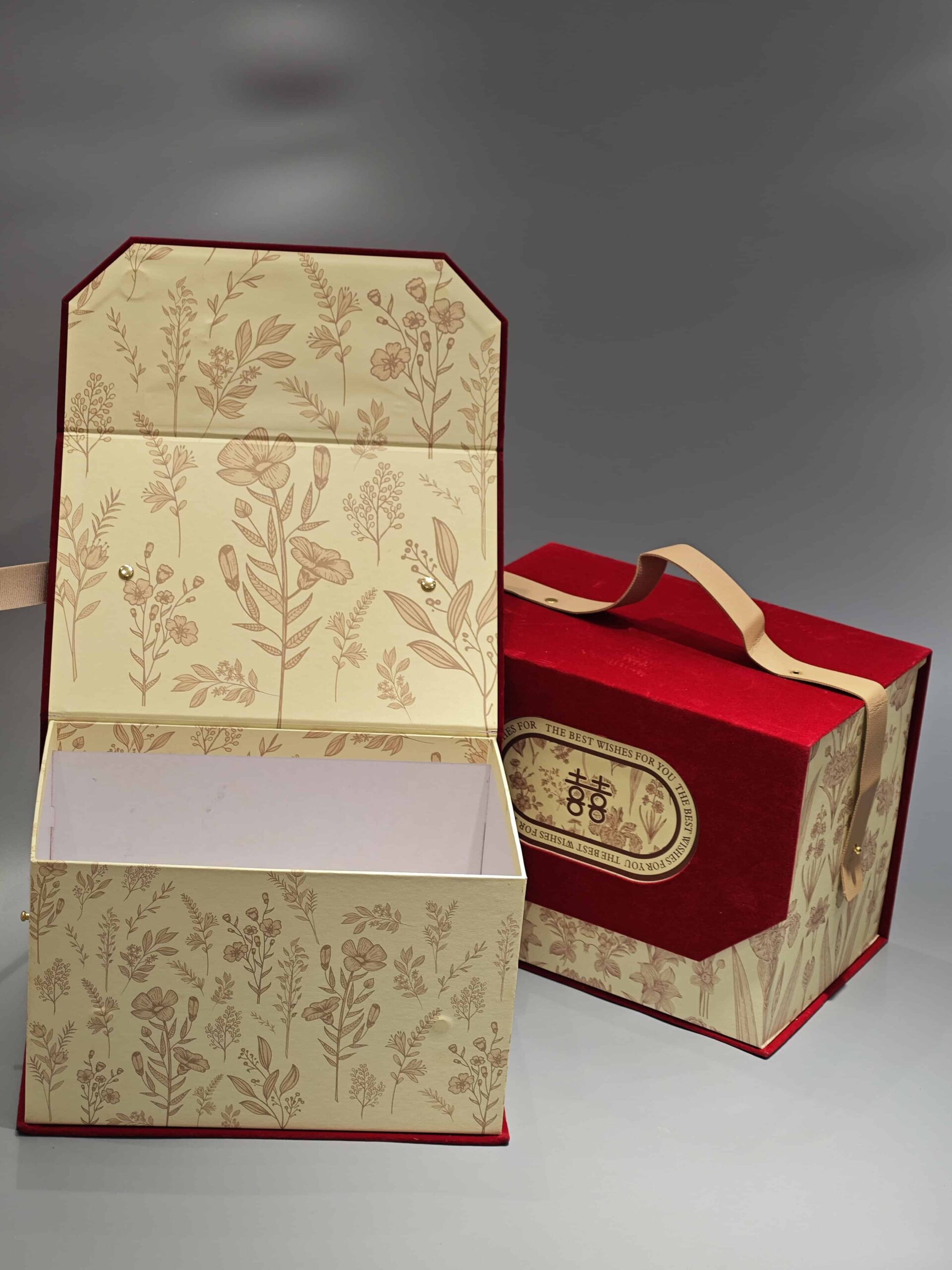 The Trapezoid flip-top gift box set consists of two boxes in red and green, each featuring a button and strap closure. Designed for the luxury gift industry, these boxes incorporate metal rings and leather accents for a premium look. The distinctive trapezoid shape and flip-top mechanism provide a unique presentation option for high-end products.