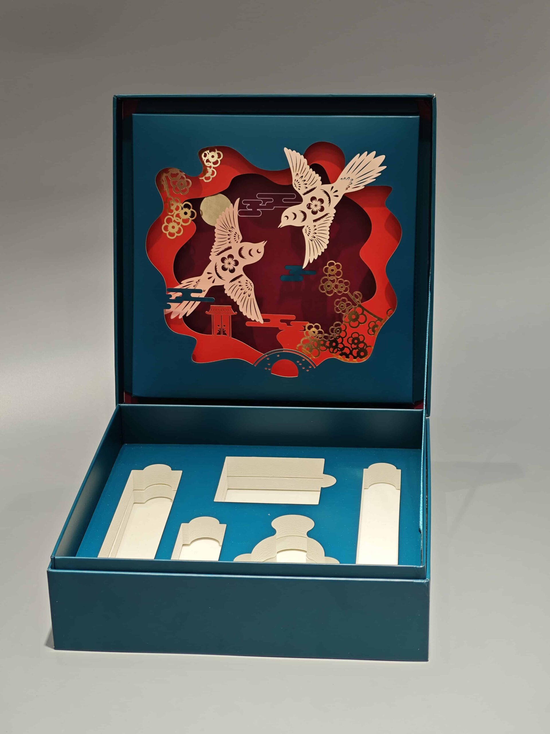 The custom blue lift-off lid box is designed for cultural heritage items in the gift industry. This box features gold detailing and blends traditional and contemporary aesthetics, incorporating both English and Chinese elements. The result is a refined presentation that honors cultural heritage while appealing to modern sensibilities.