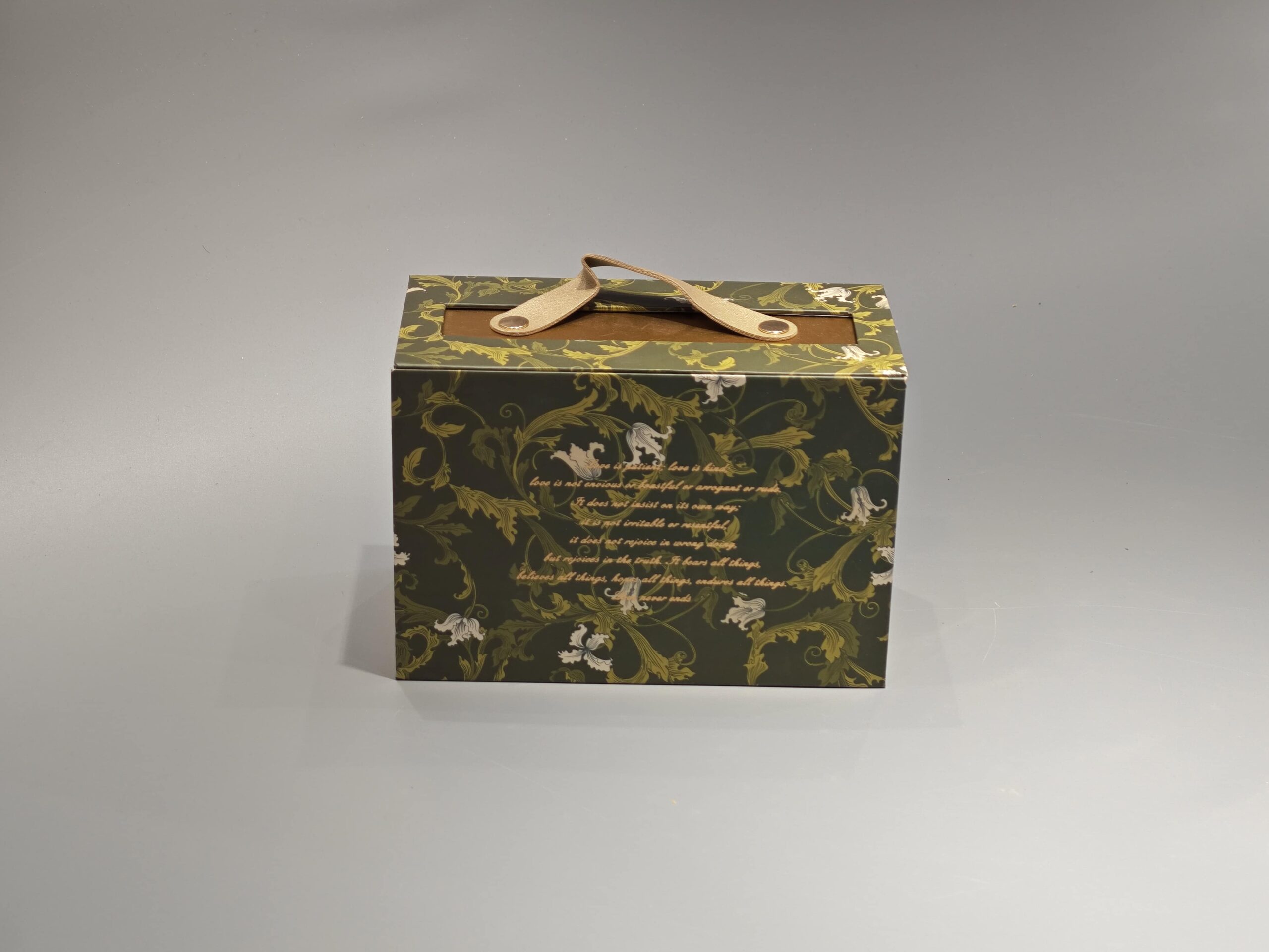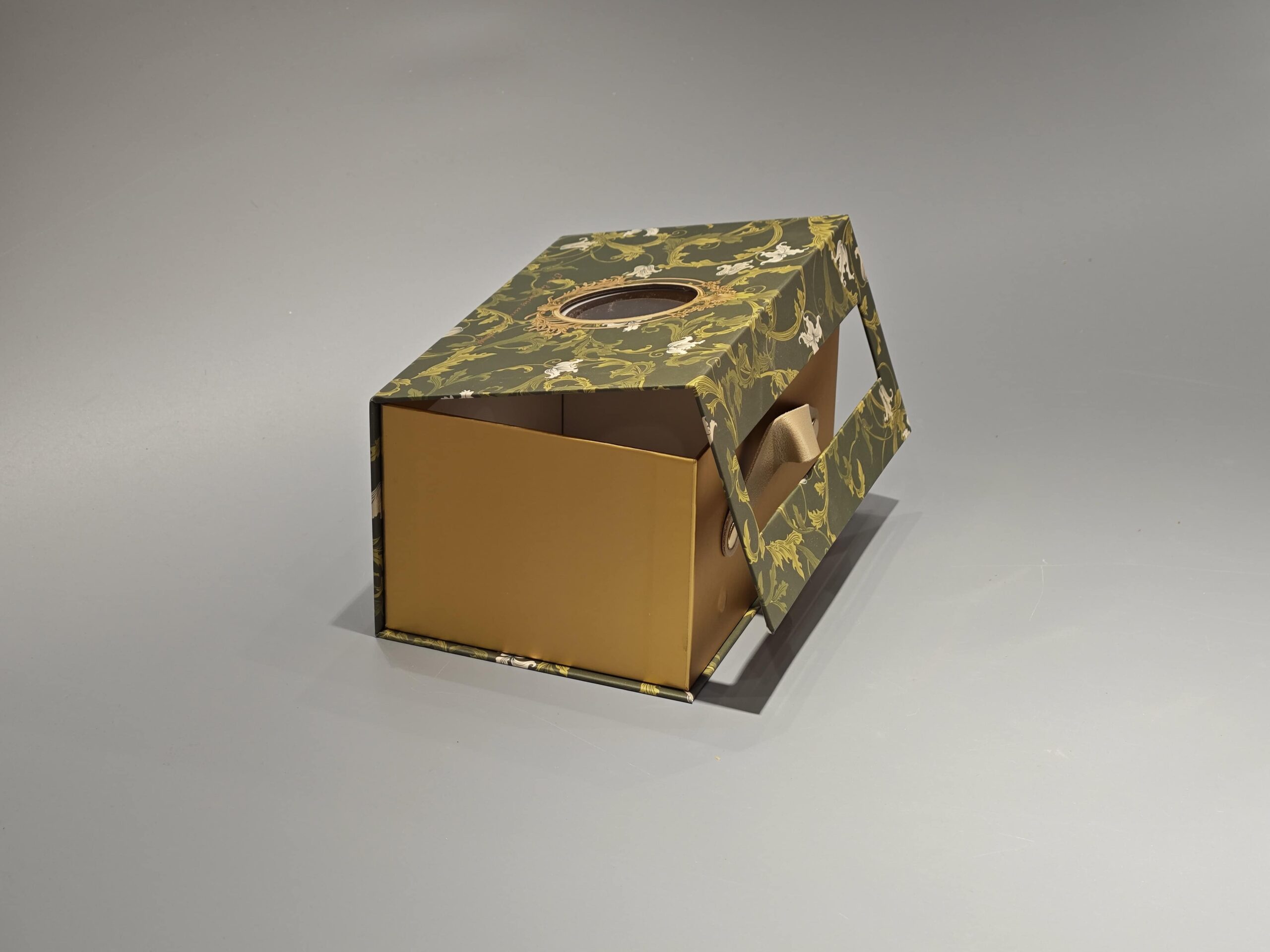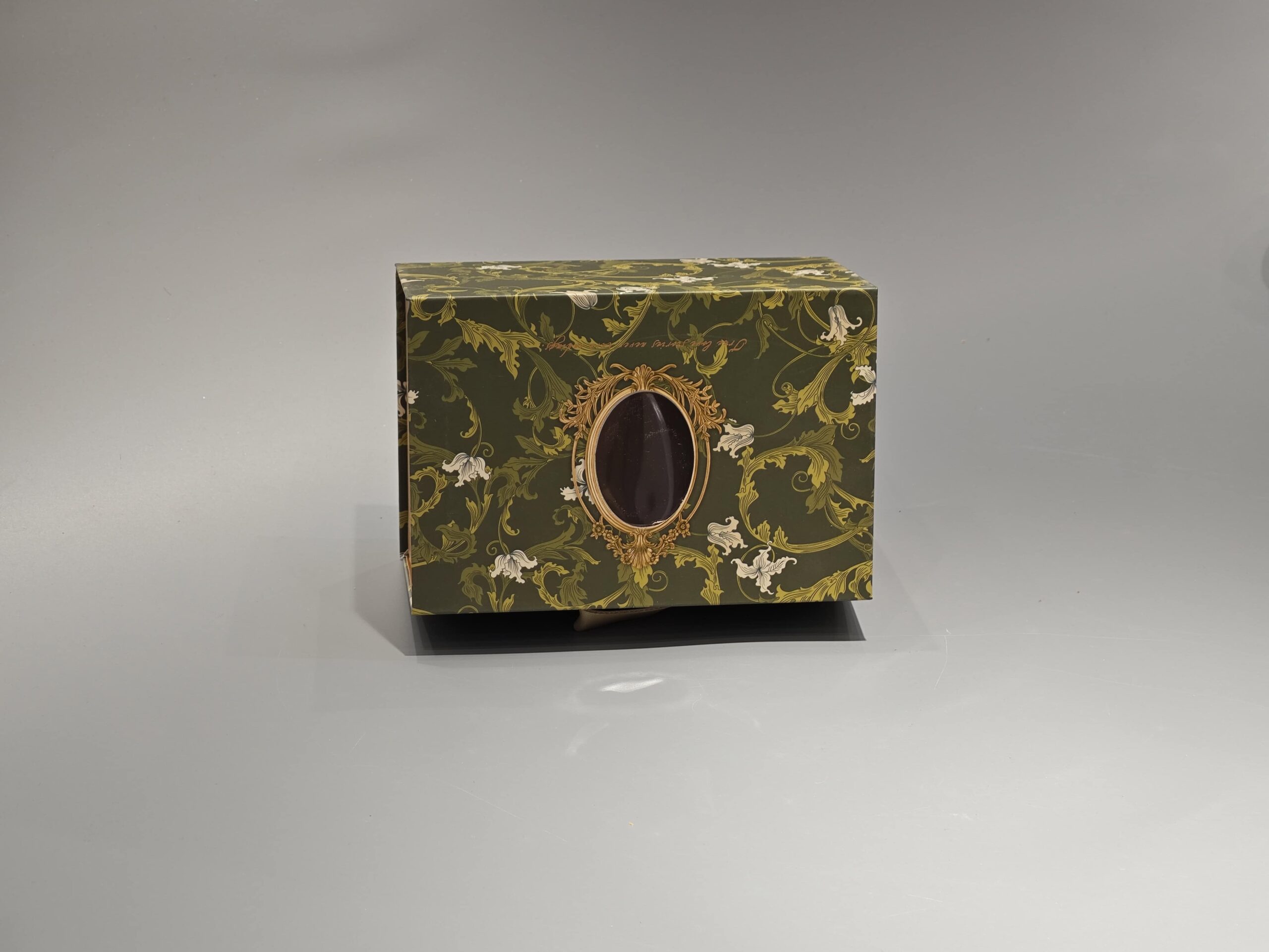 This custom gift box features a magnetic closure and a partial cover with a window, designed for the gift industry. The rigid, one-piece construction in green provides structural integrity, while the window allows visibility of the contents. Its magnetic closure mechanism facilitates easy opening and secure closing, making it suitable for presenting various gift items.
