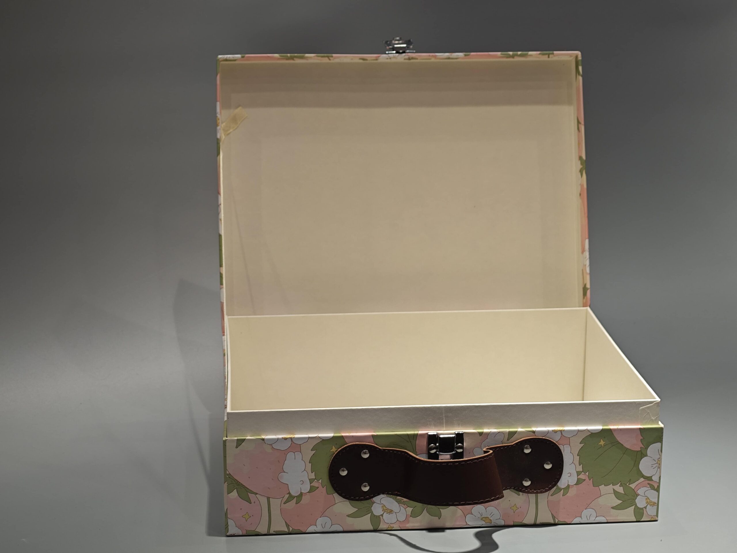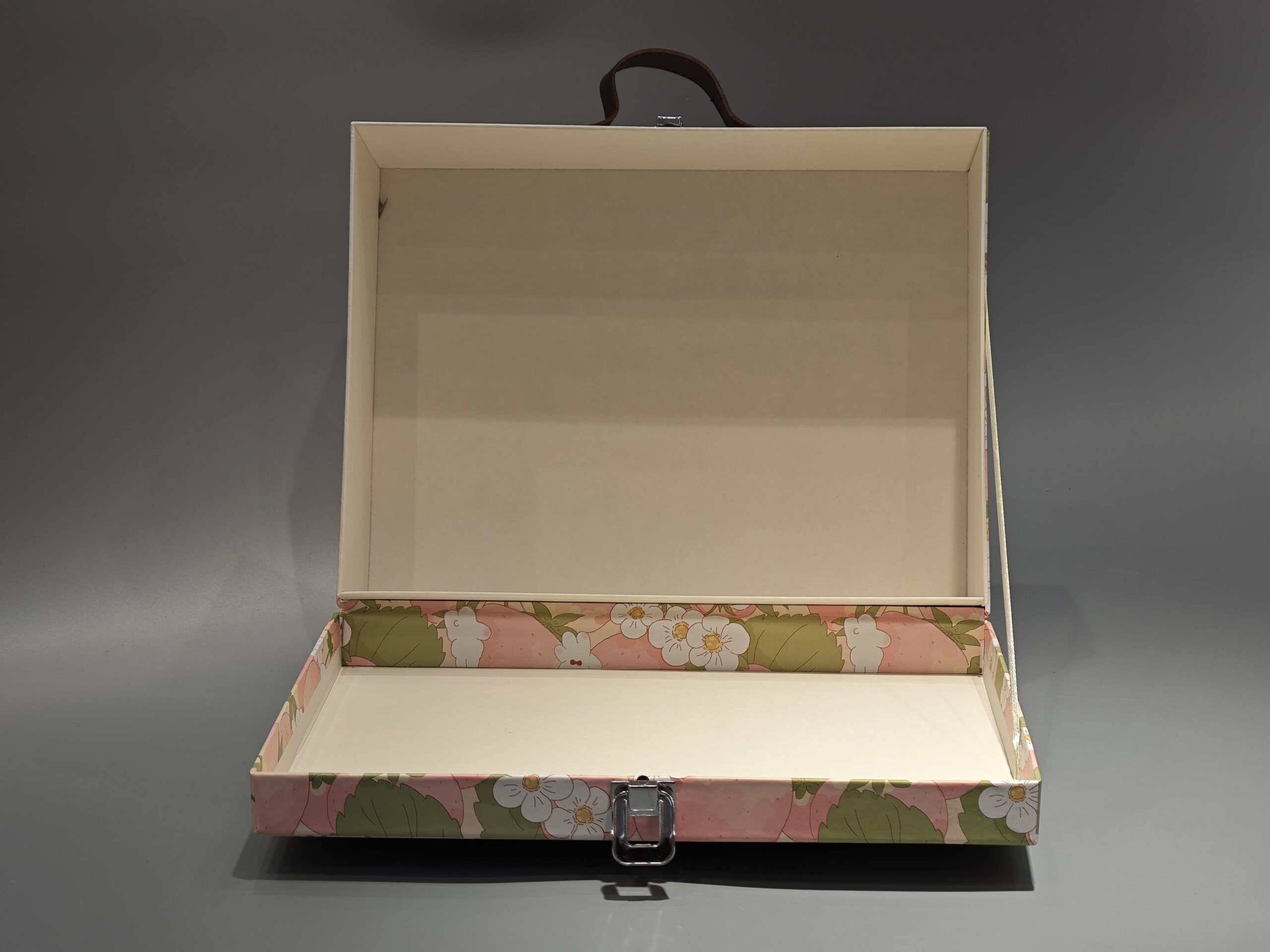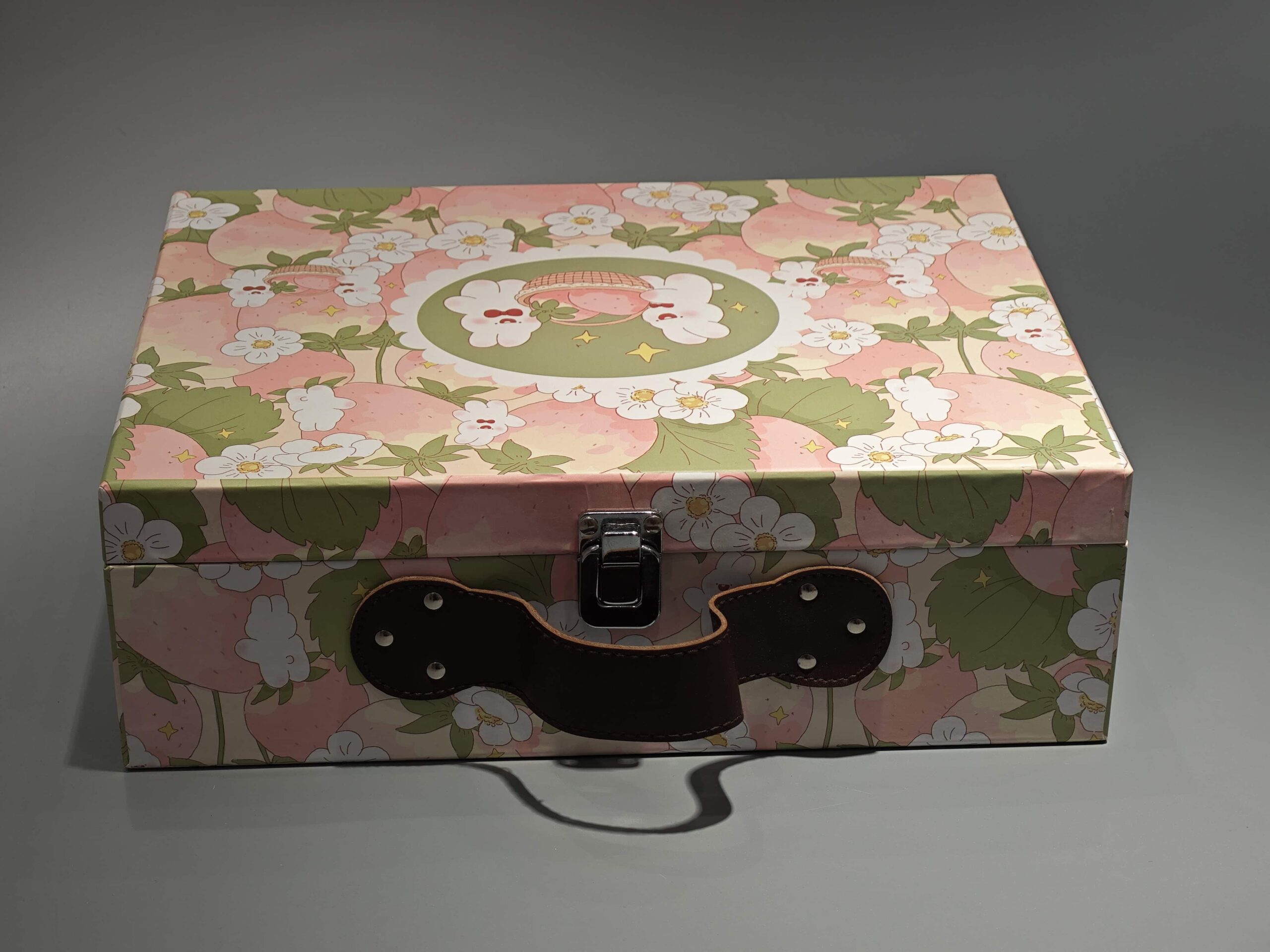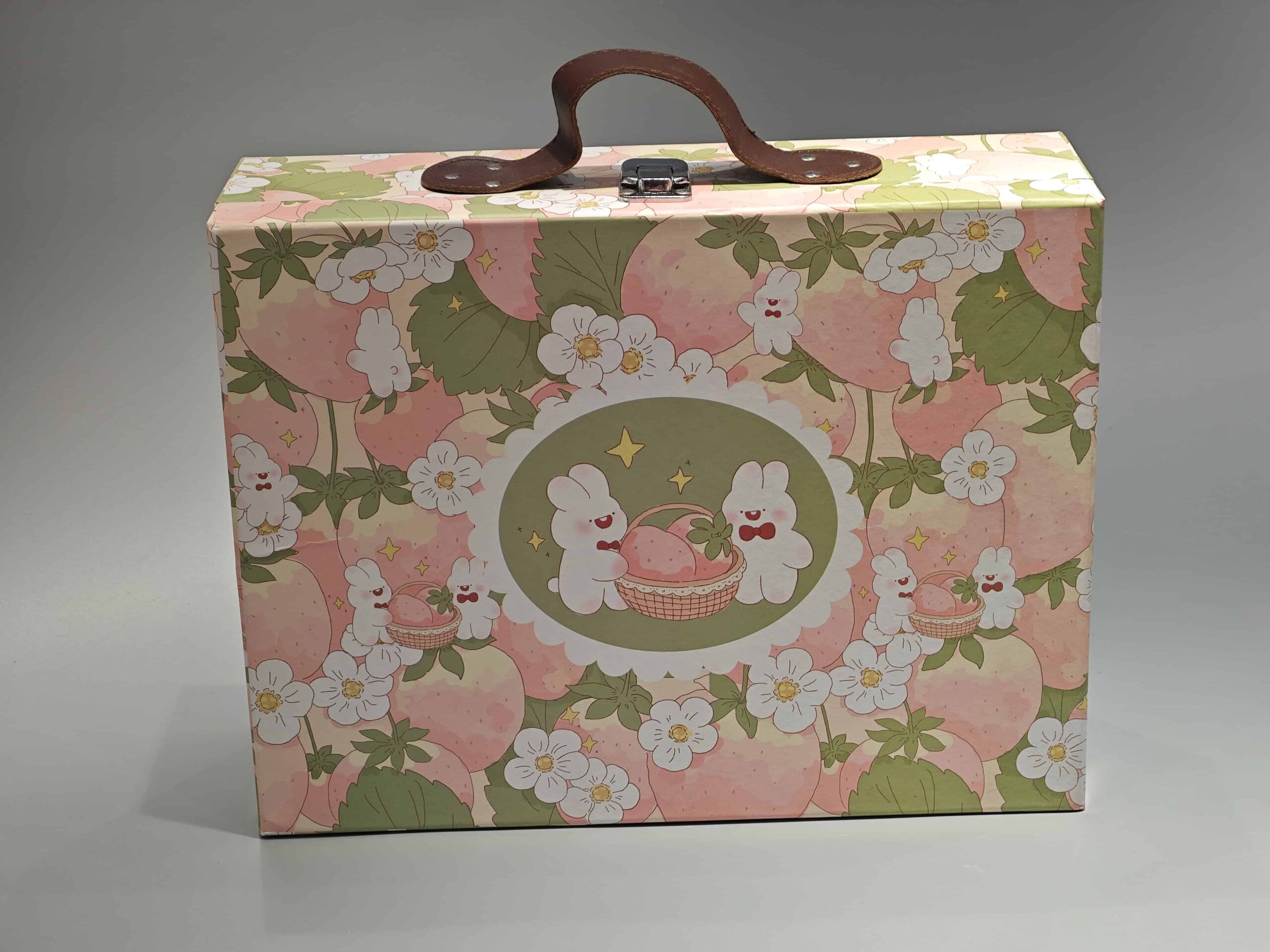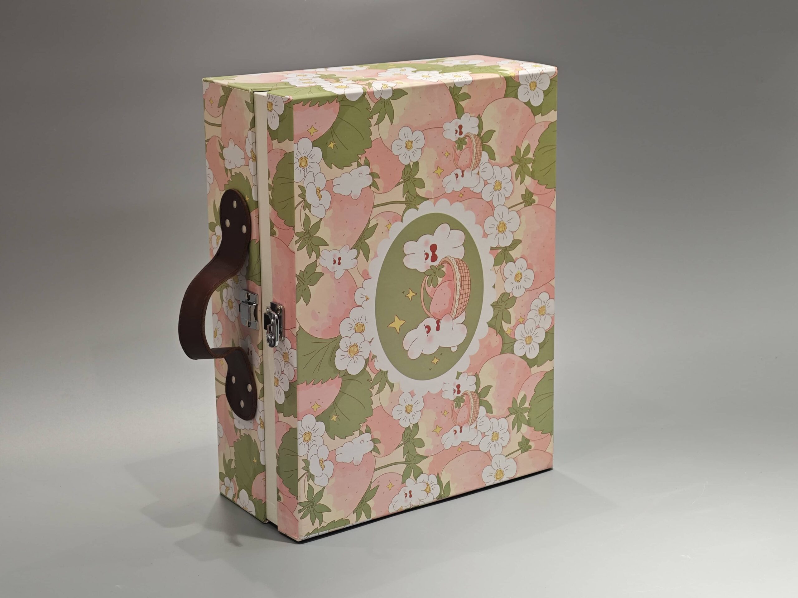 This custom flip top box features a floral and bunny design, suitable for gift and cosmetic packaging. It includes a brown leather handle for portability, a white clasp for secure closure, and a circular logo emblem for branding. The box’s craftsmanship is showcased through its detailed design and functional elements.