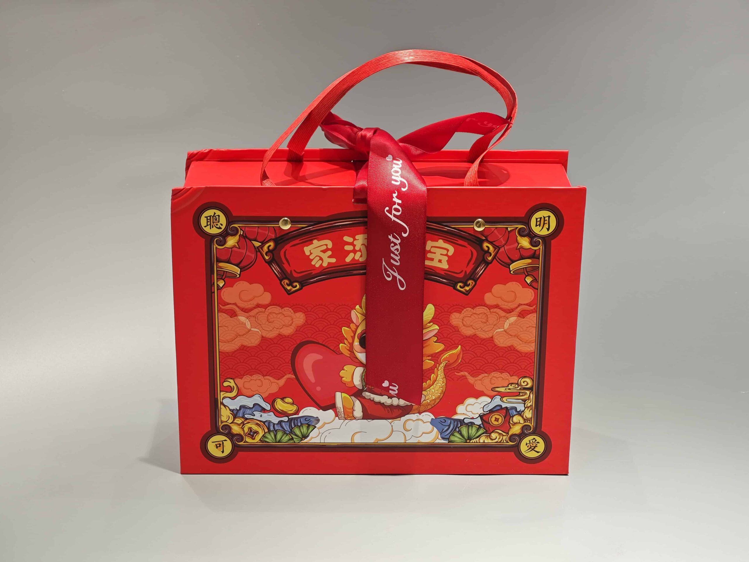 This custom portable flip-top gift box showcases a vibrant red color with a playful cartoon lion design and elegant decorative elements. Sturdy red ribbons serve as handles, providing easy portability for the box. The attractive appearance and practical design make it suitable for presenting cosmetic products as gifts, enhancing their visual appeal.