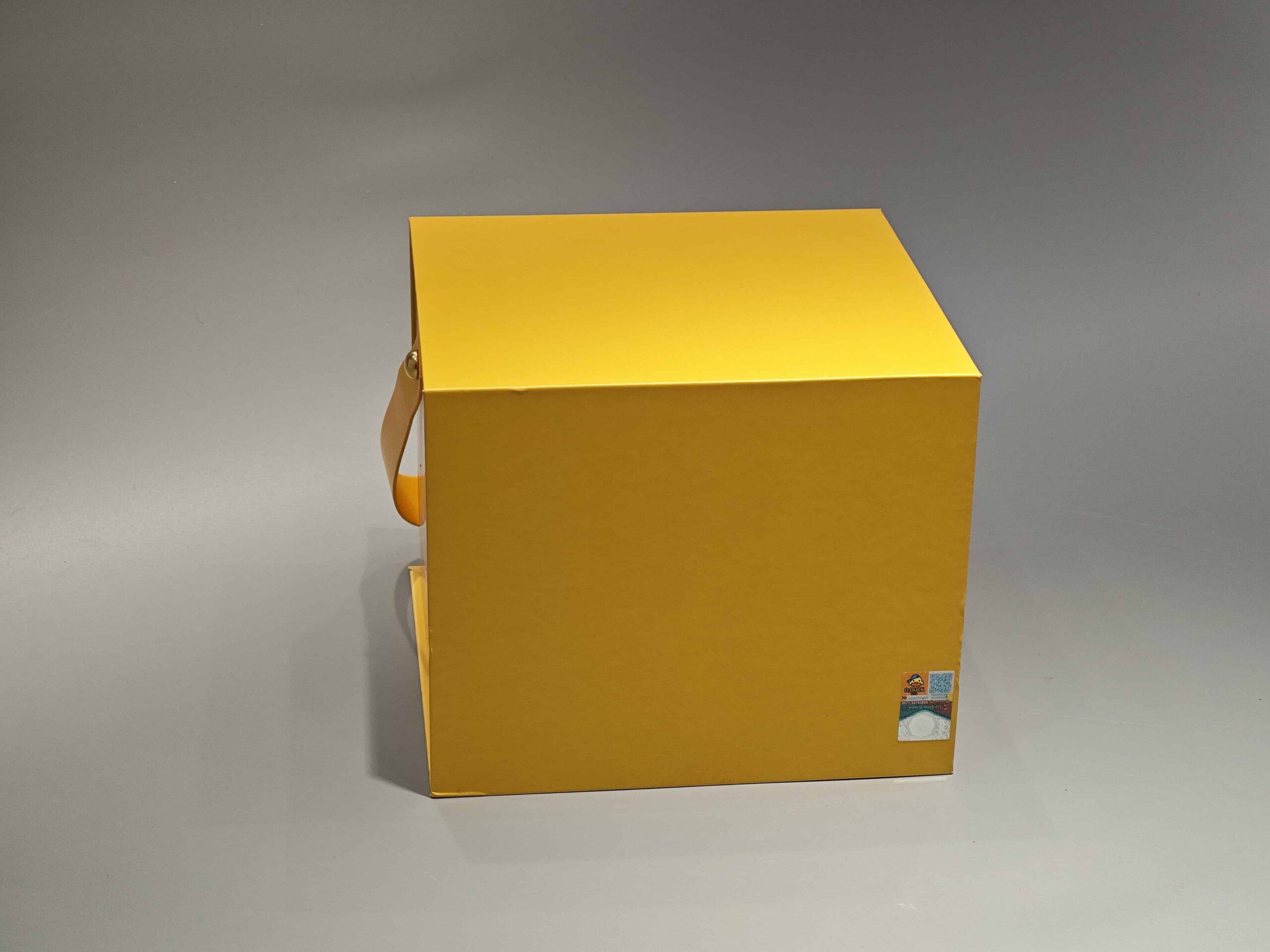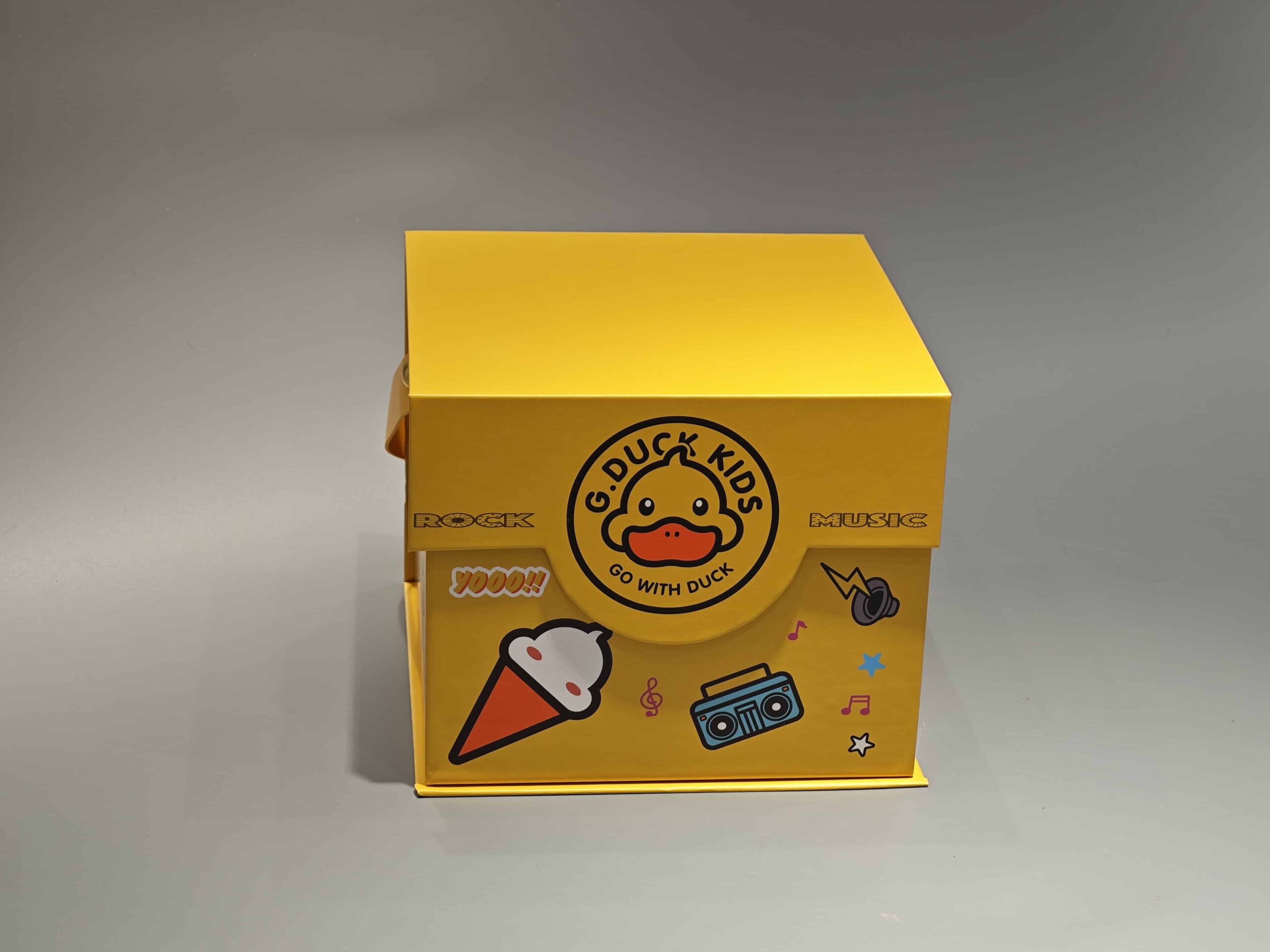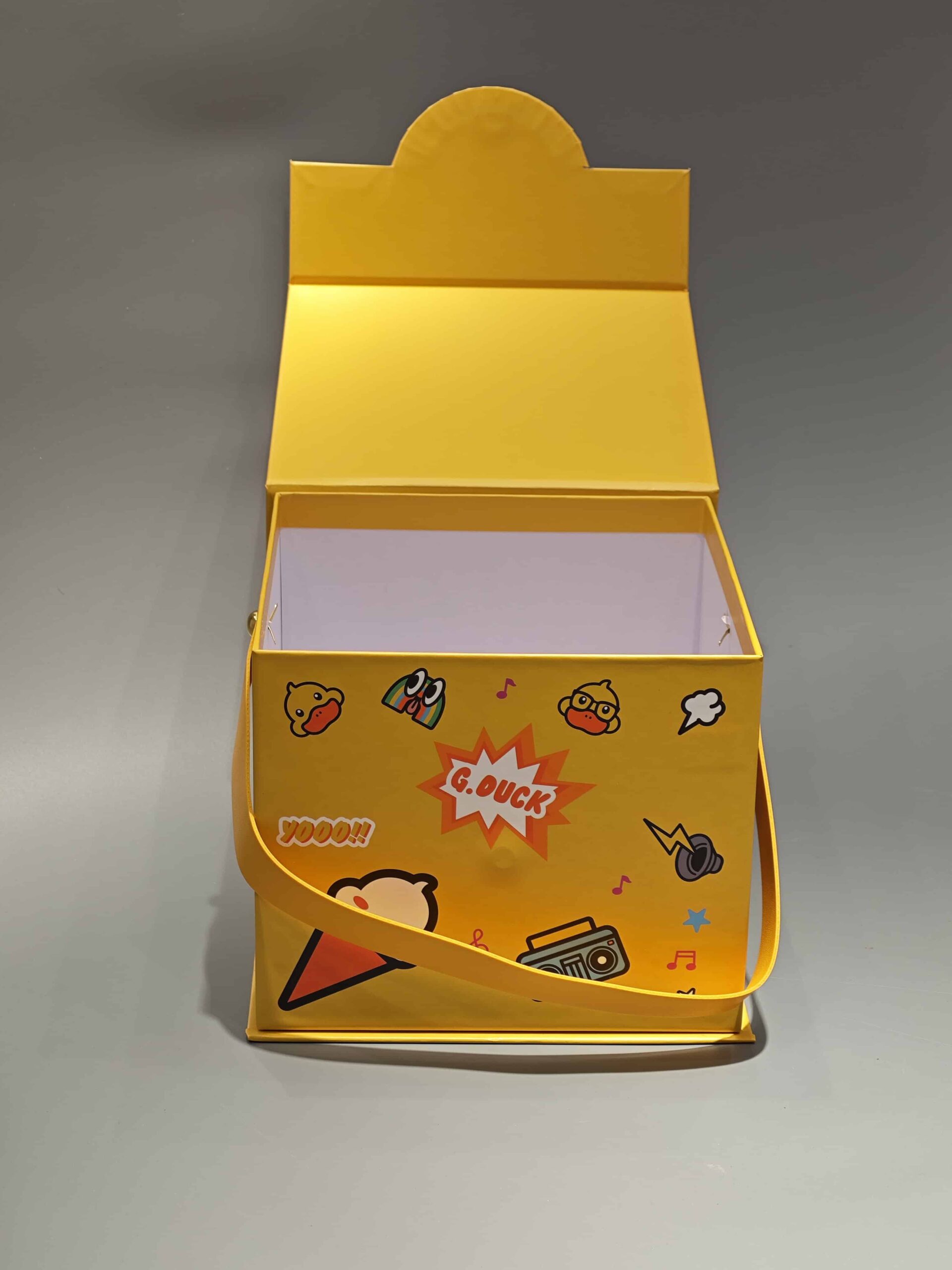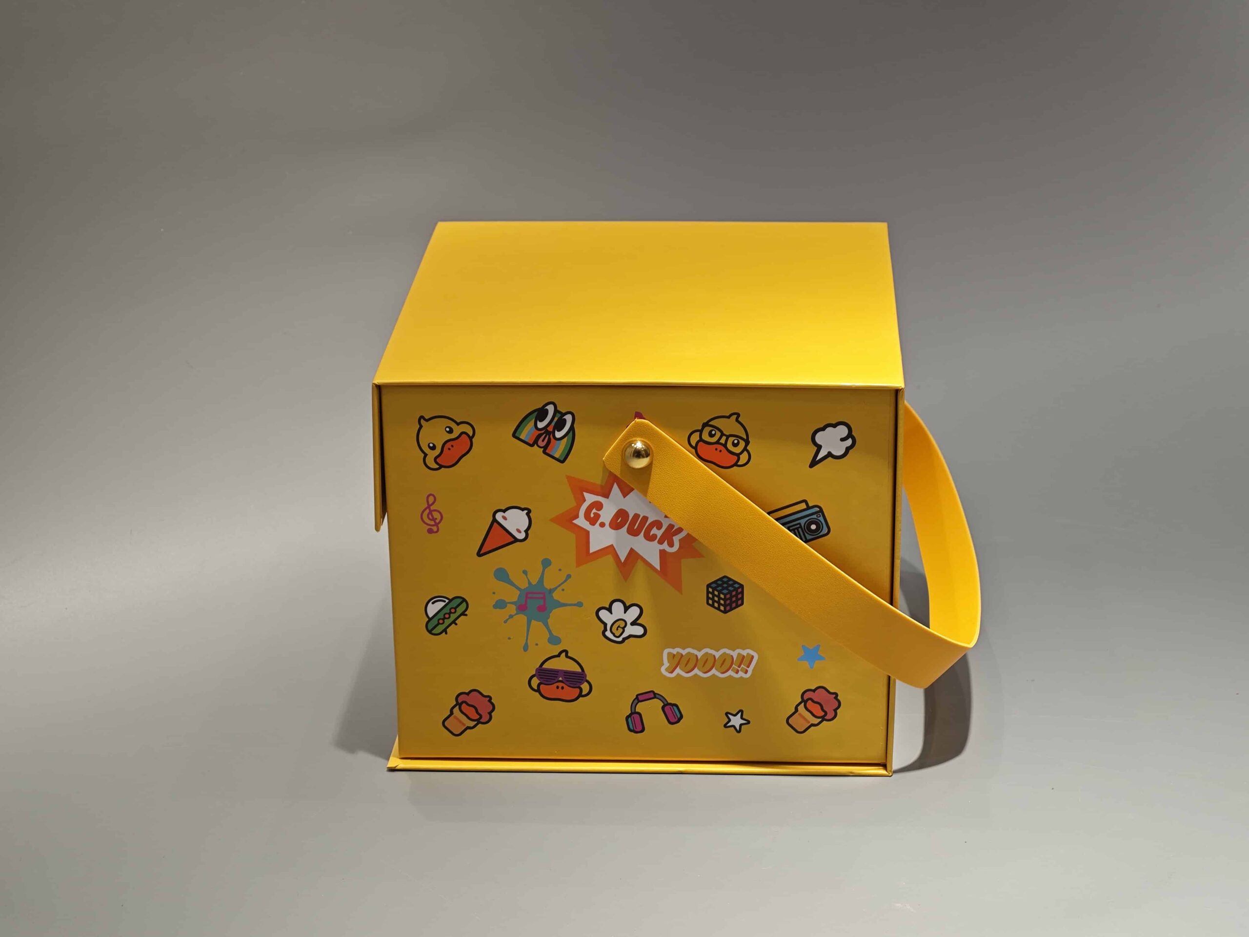 This custom-designed portable gift box features a vibrant yellow exterior with playful imagery, including a cartoon duck logo and various fun elements, perfect for food or toy packaging. The box incorporates a convenient handle for easy carrying and a secure magnetic closure, ensuring both visual appeal and practical functionality in retail settings.