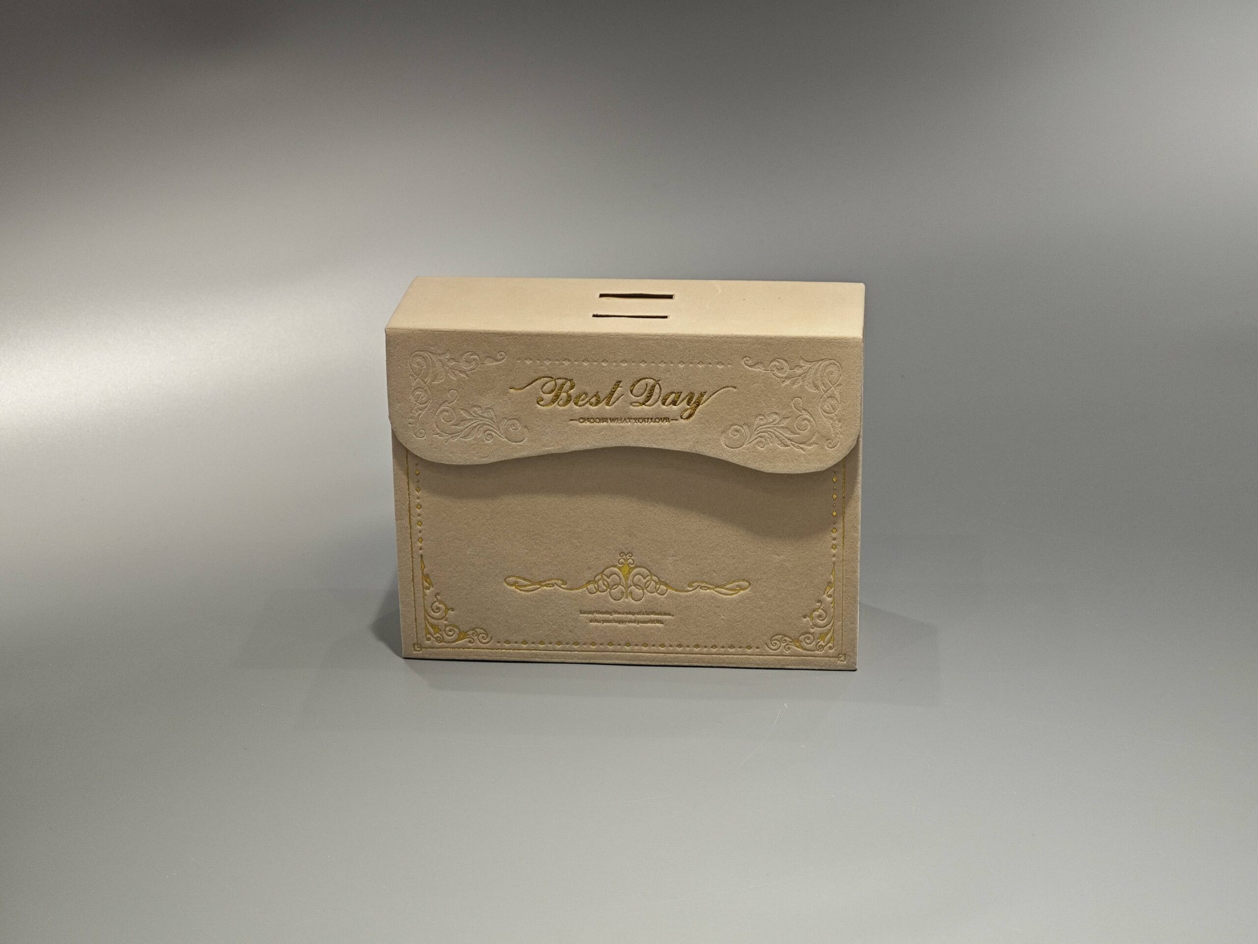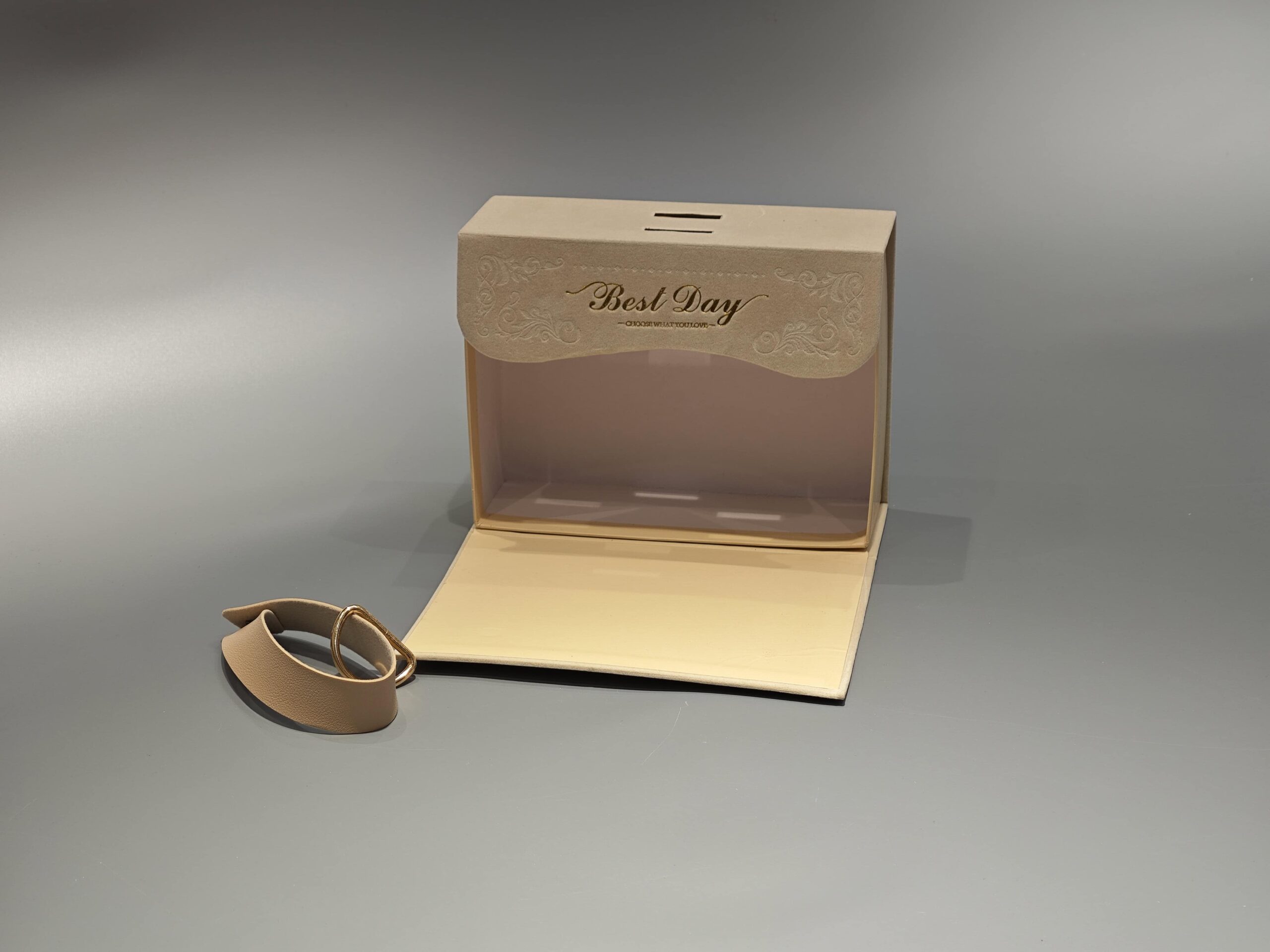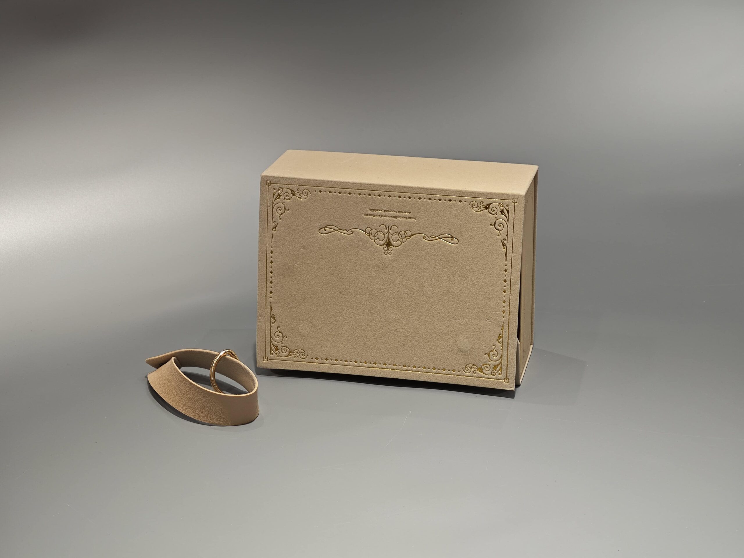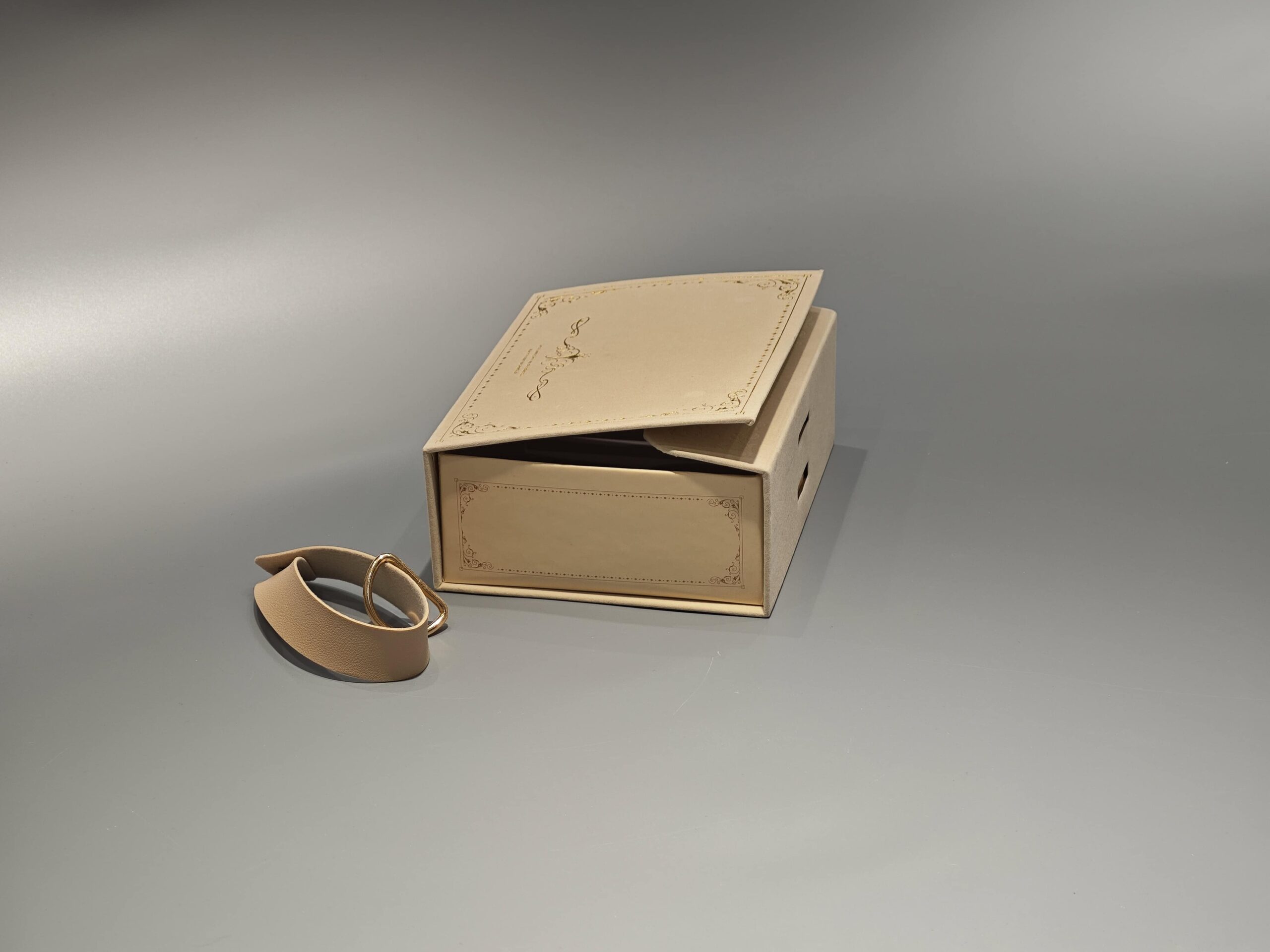 This custom flip-top gift box showcases a textured surface in beige, featuring a string closure for secure packaging. Designed for the gift industry, it provides a distinctive packaging option for various products and special occasions.