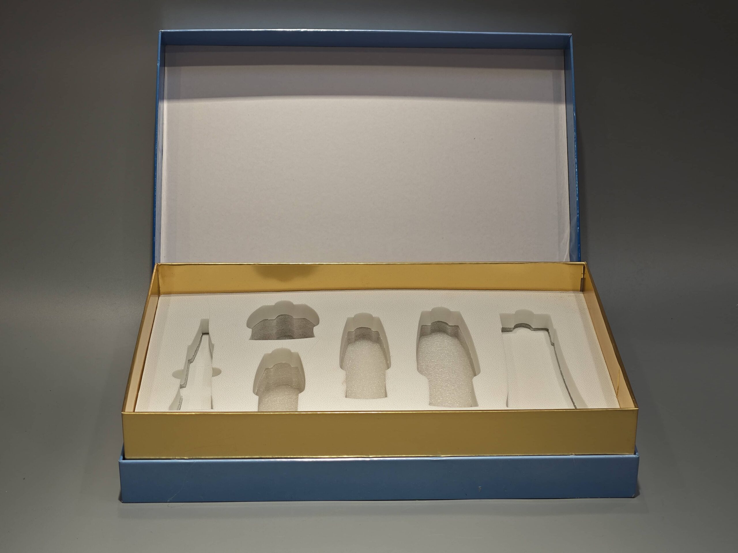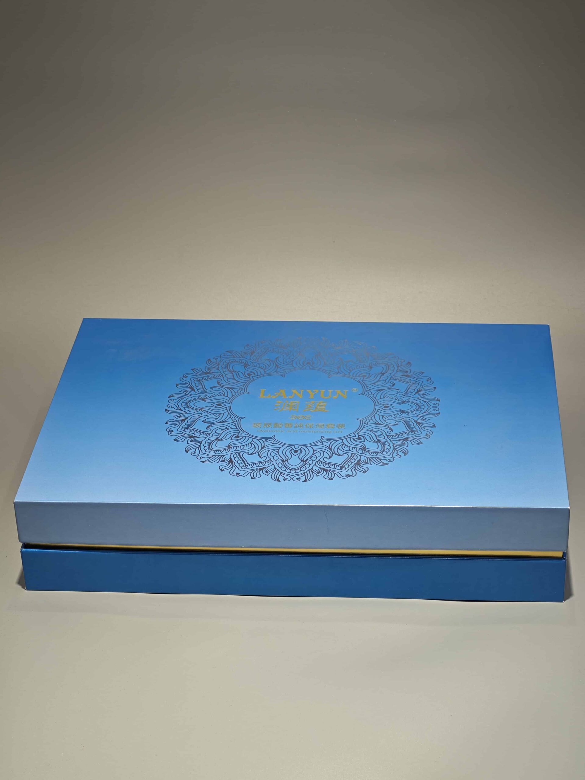The Custom skin care shoulder neck box is a 2-piece packaging solution for the personal care industry. It features intricate floral patterns created through offset printing and enhanced with foil stamping. This custom design combines aesthetic appeal with practical functionality, catering to the packaging needs of high-end skin care products.
