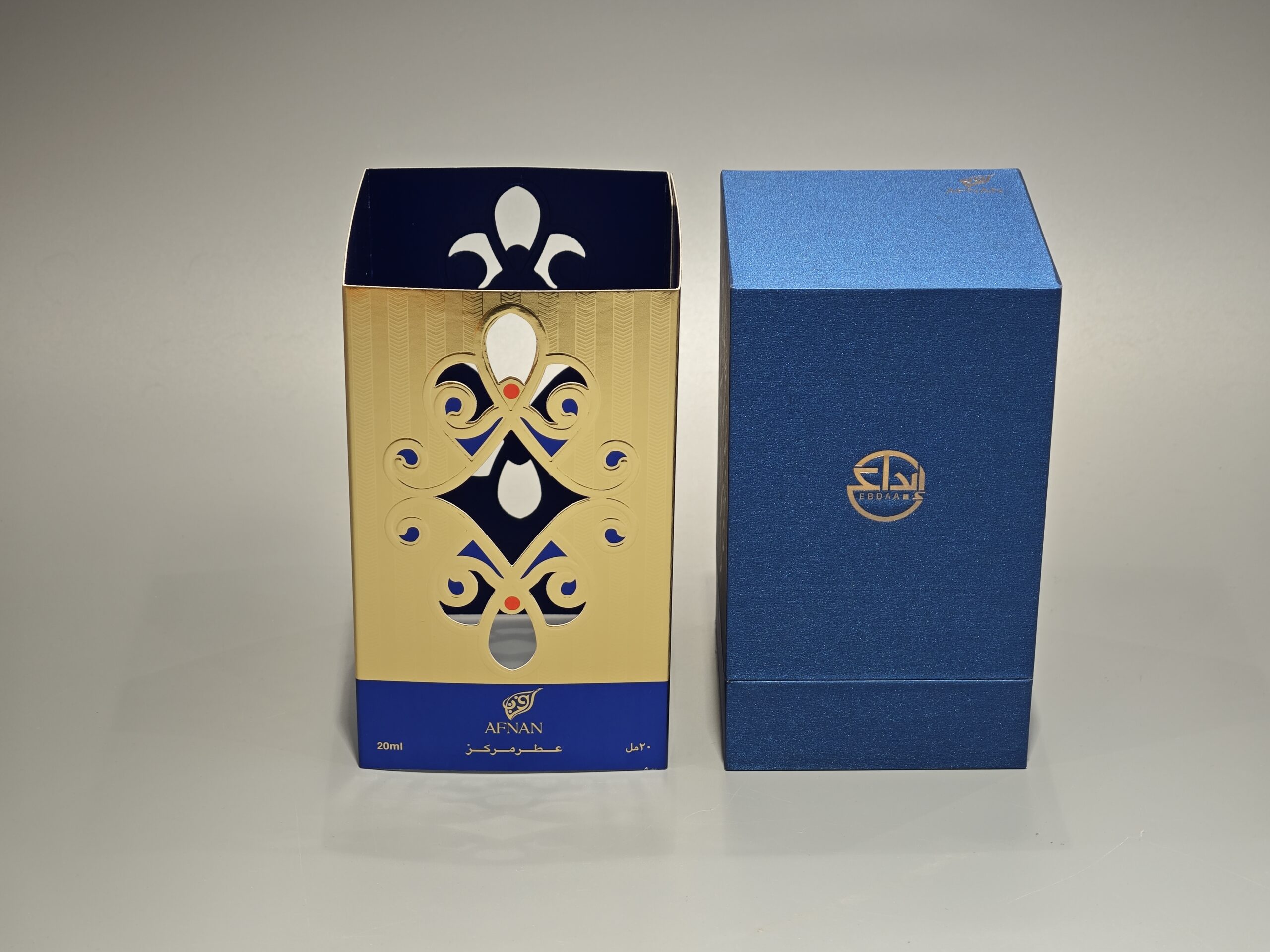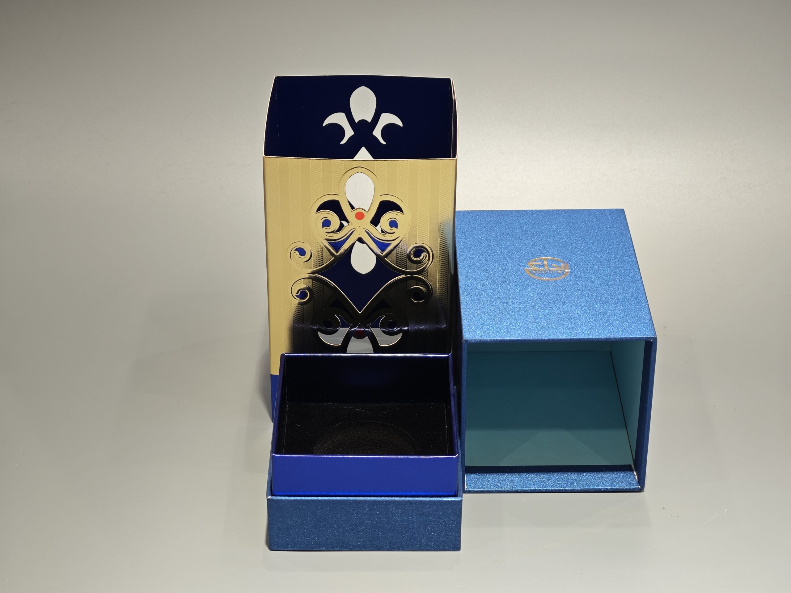 This handmade blue cosmetic box incorporates foil stamping, embossing, and varnishing techniques, catering to the luxury perfume packaging industry.