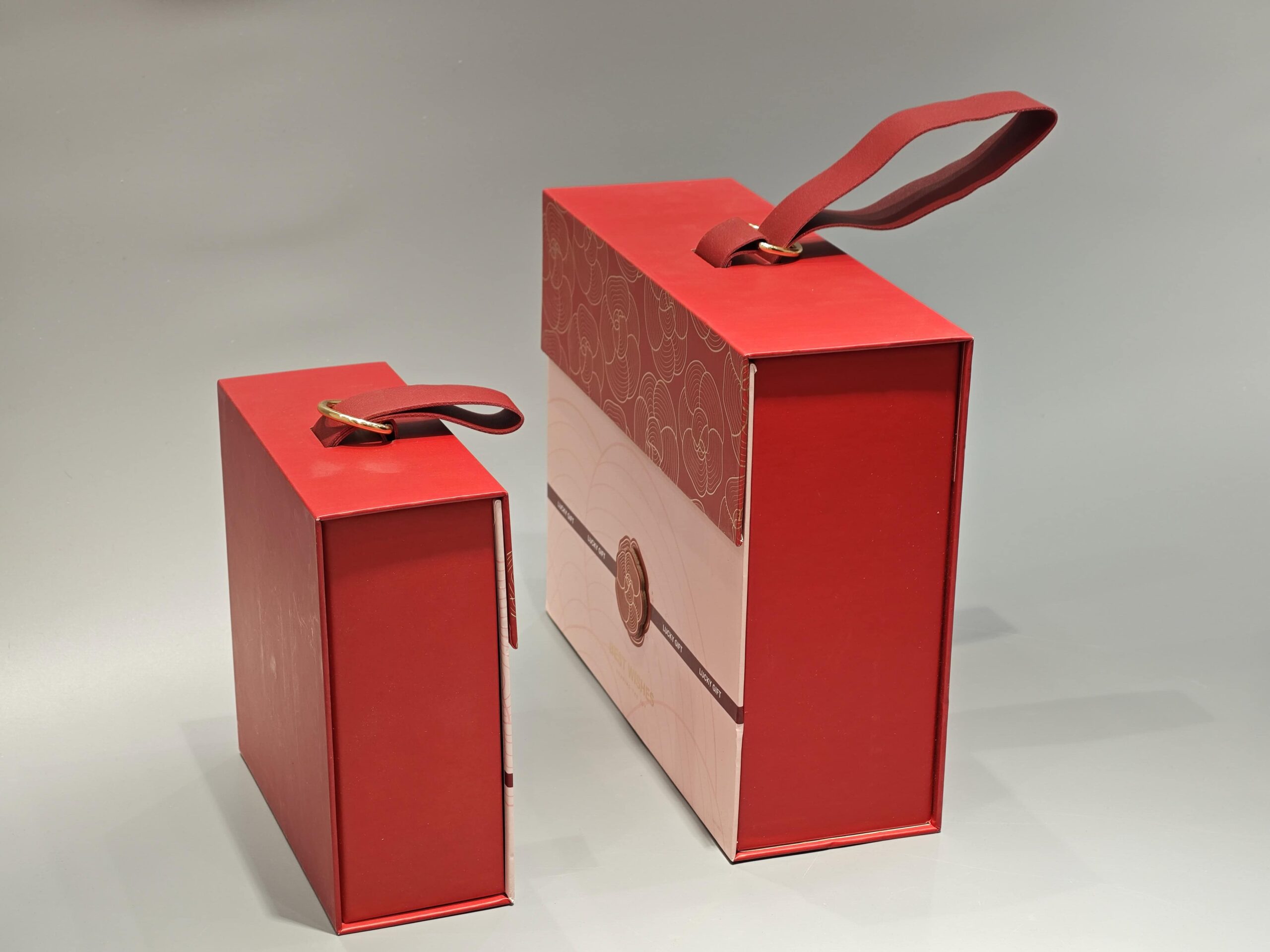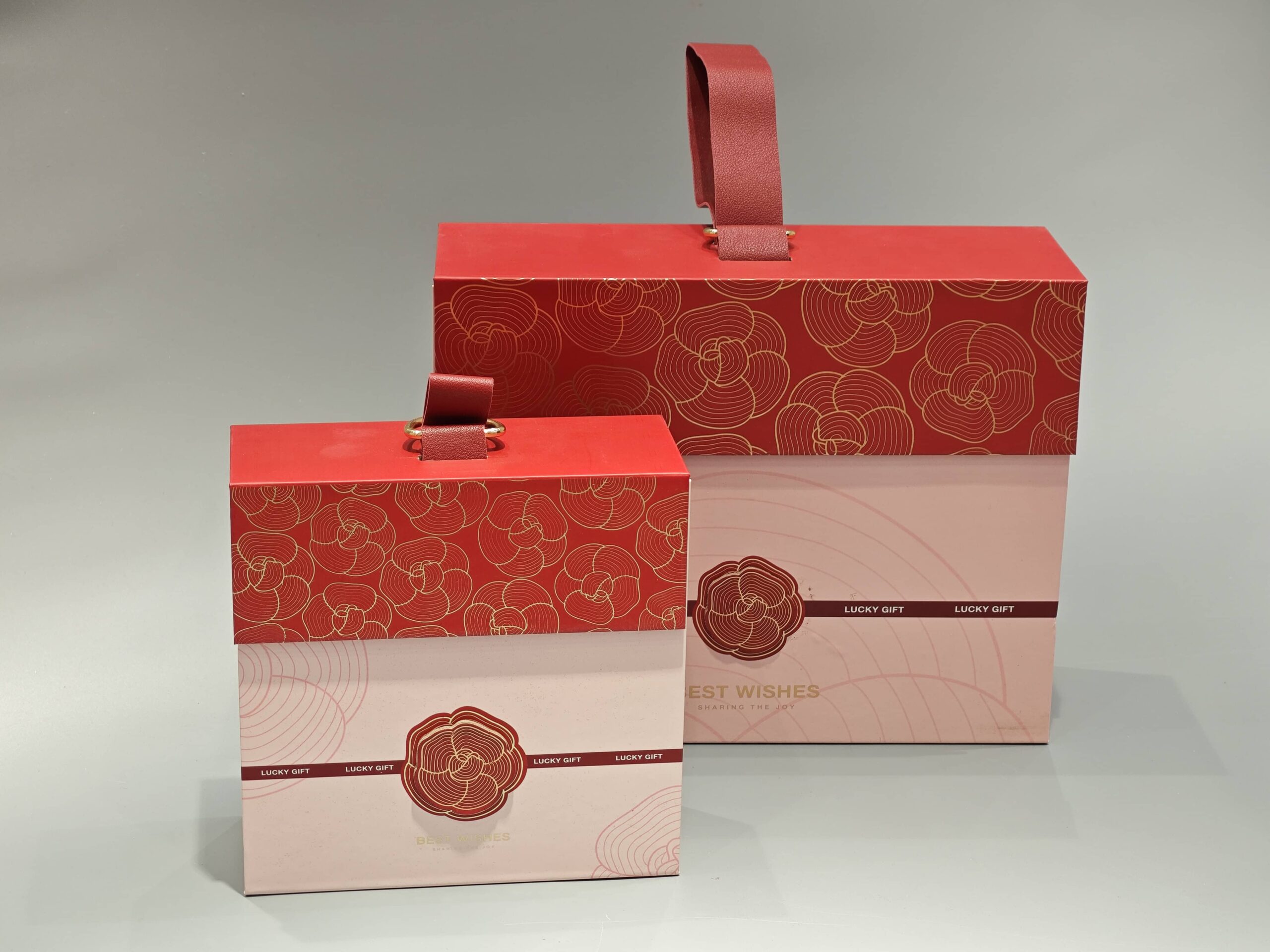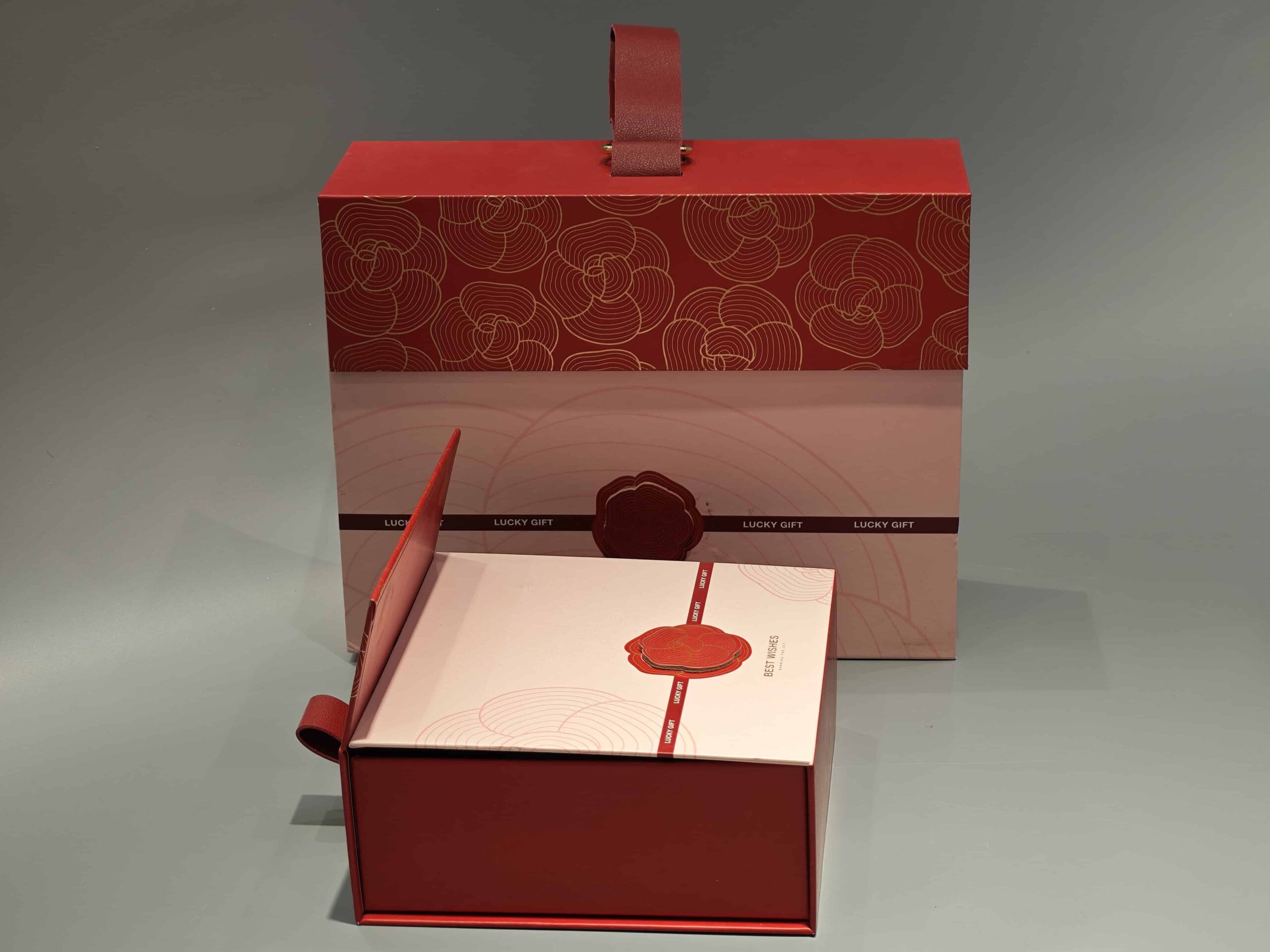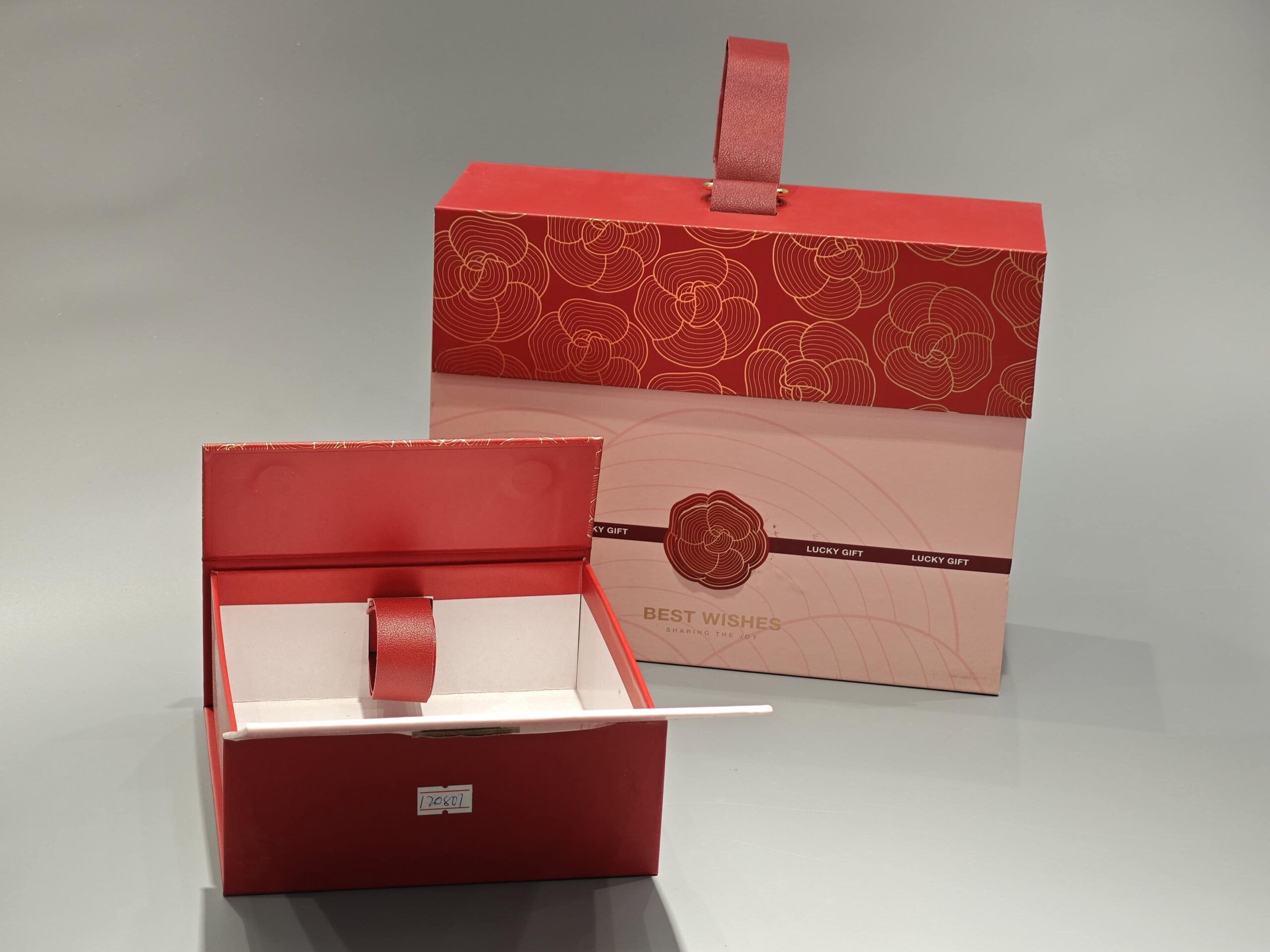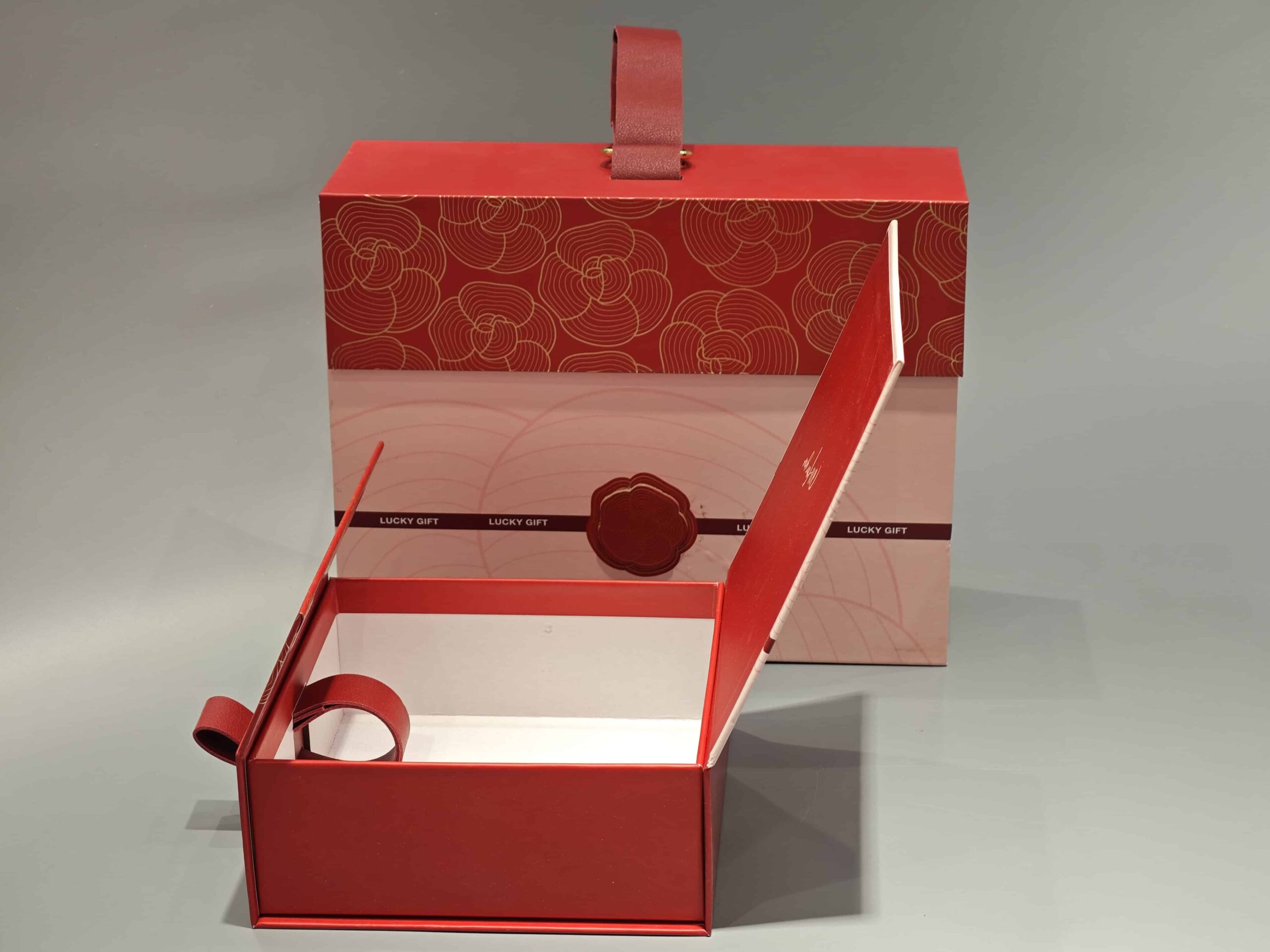 This gift box showcases a sophisticated red and white design with intricate floral patterns, suitable for the gift and cosmetic industries. It incorporates a magnetic closure for secure packaging and a sturdy handle for easy transport. These features make it well-suited for presenting high-end cosmetic products or special gifts, combining elegance with practicality.