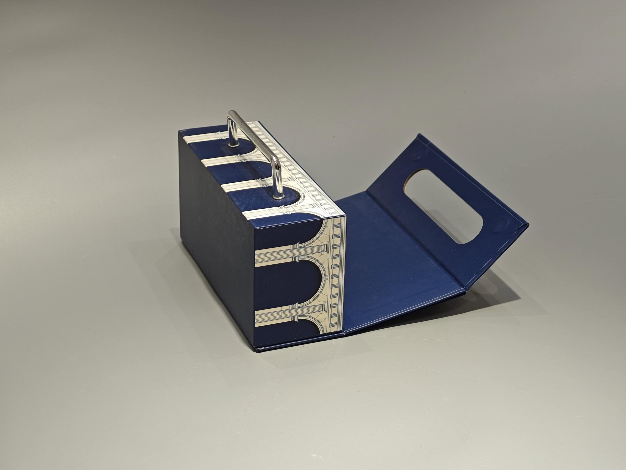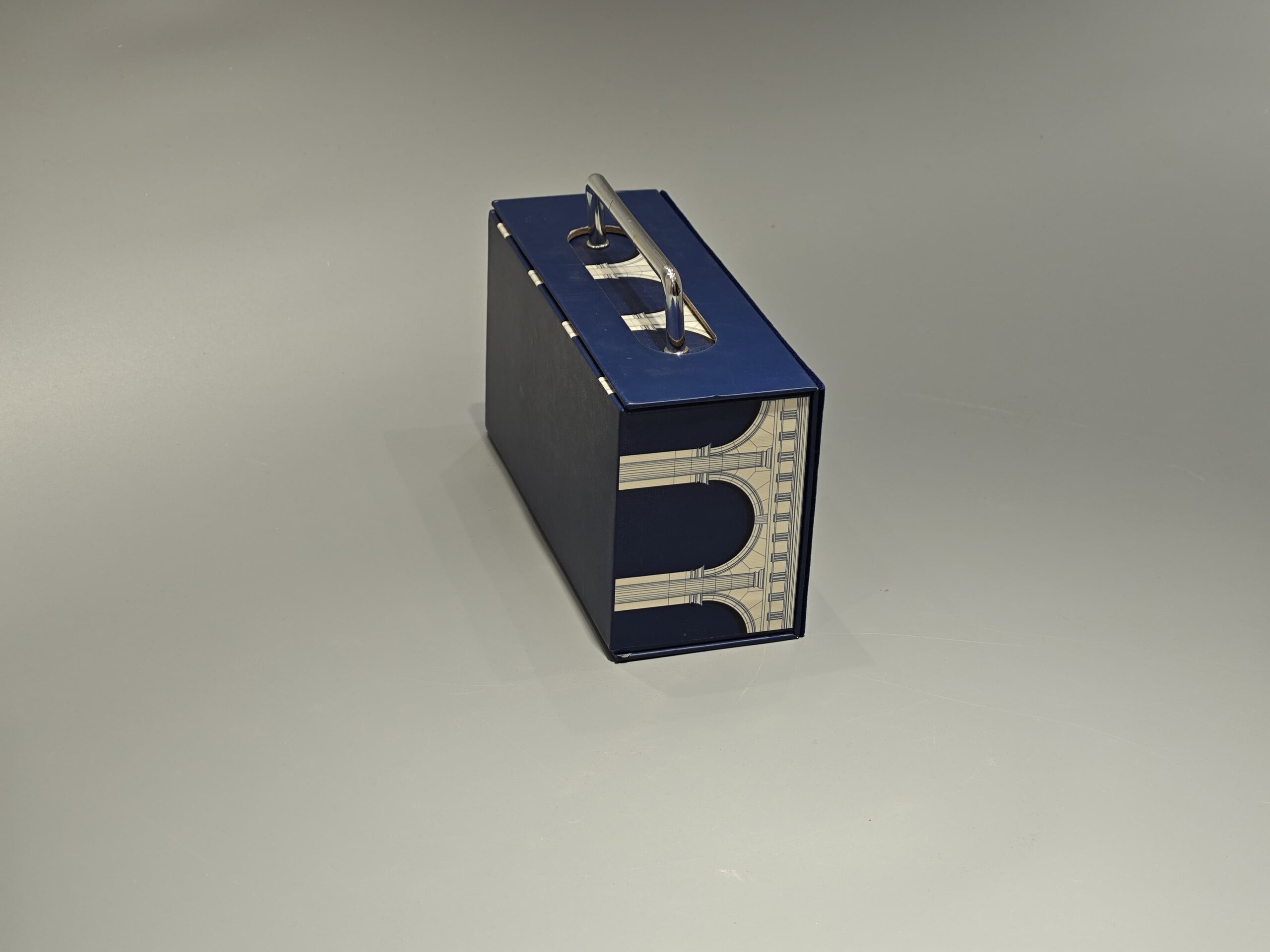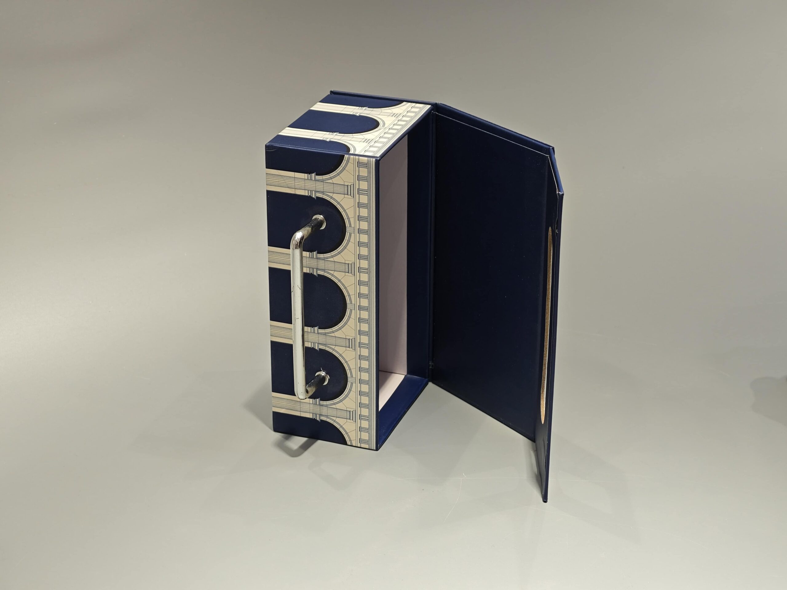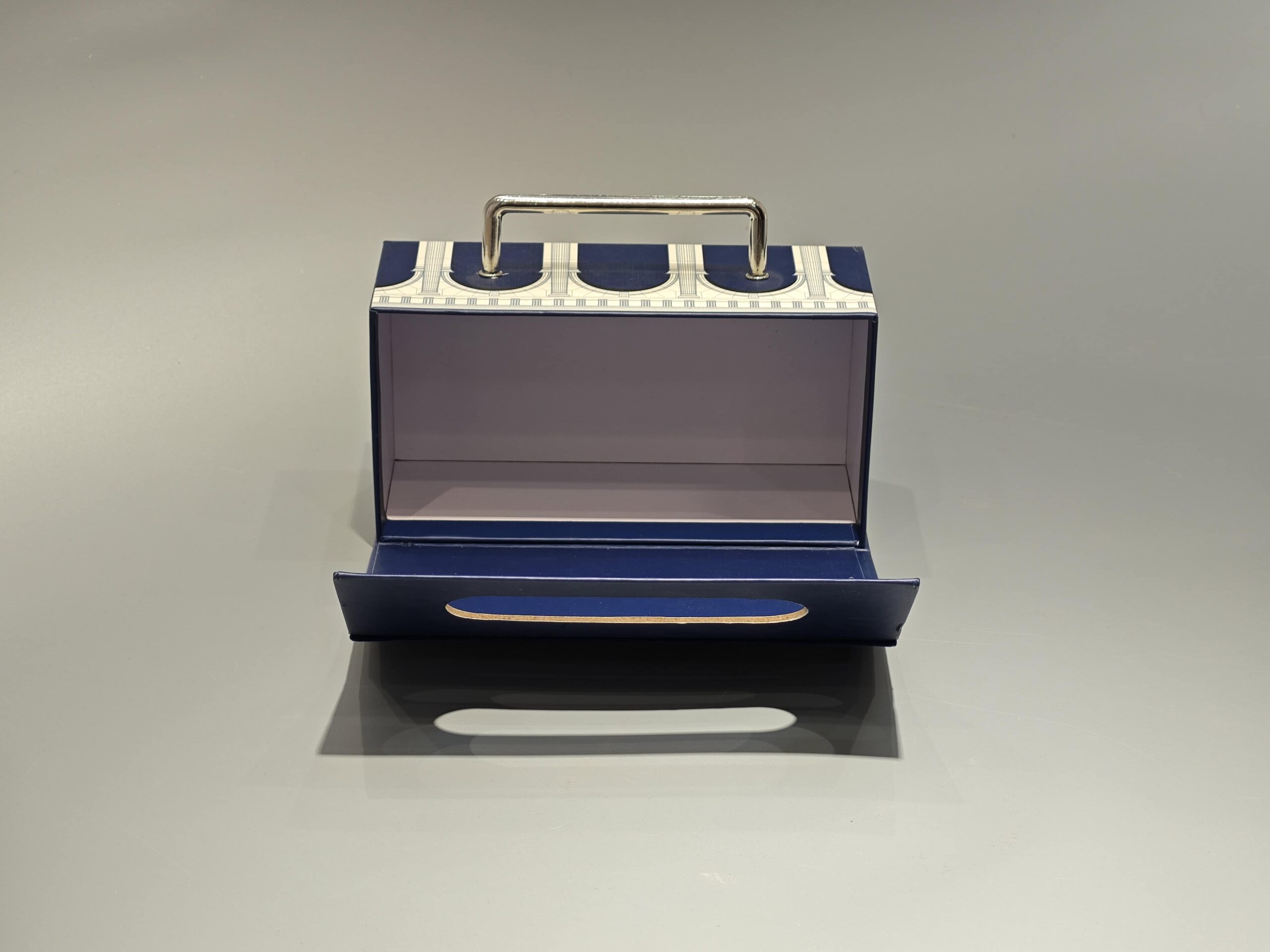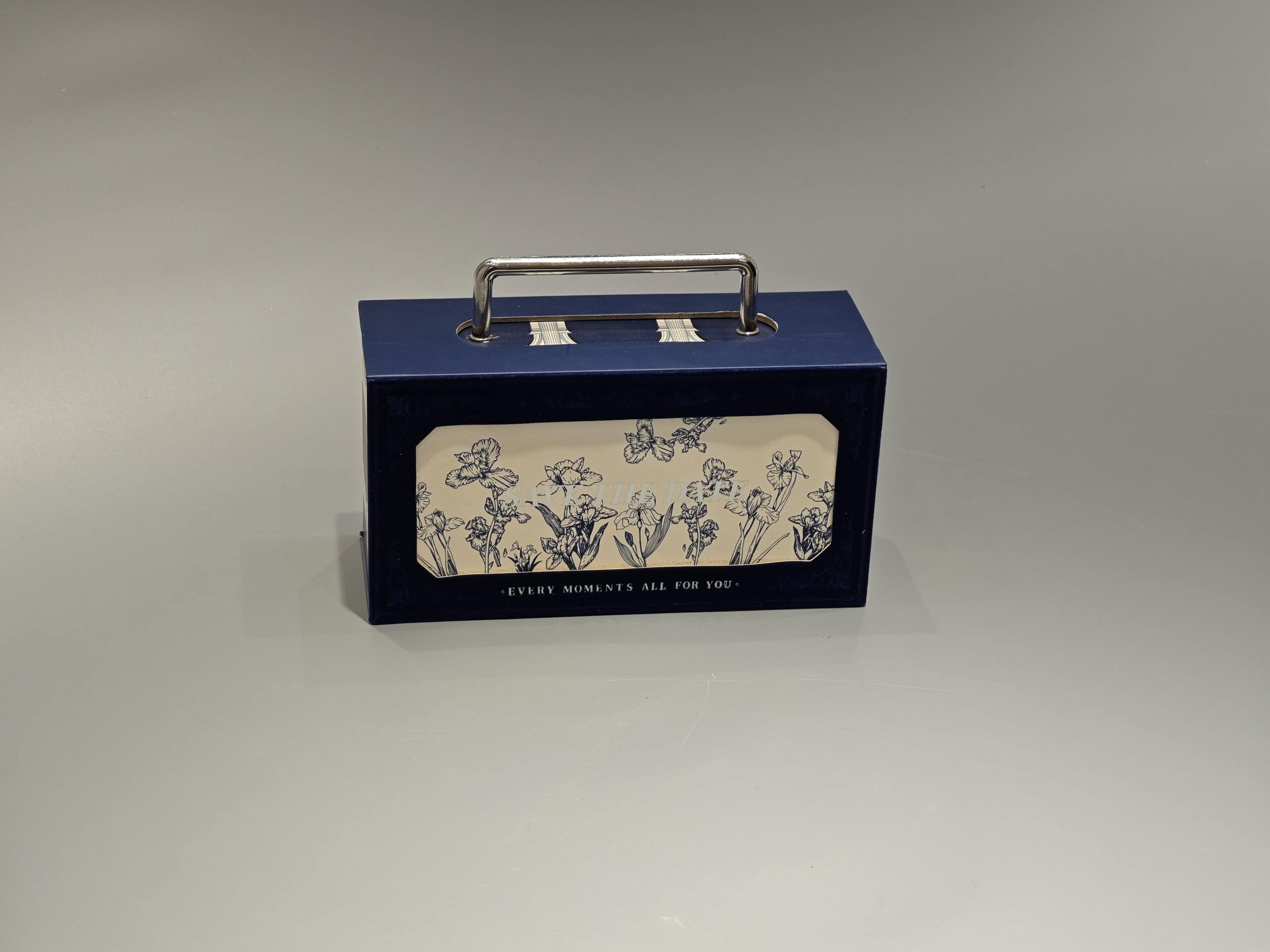 The Medium Portable Flip Top Magnetic Gift Box is a custom-designed blue packaging solution featuring a floral pattern and a metal handle. This versatile box combines functionality with aesthetic appeal, suitable for presenting cosmetics or luxury items in the gift industry.