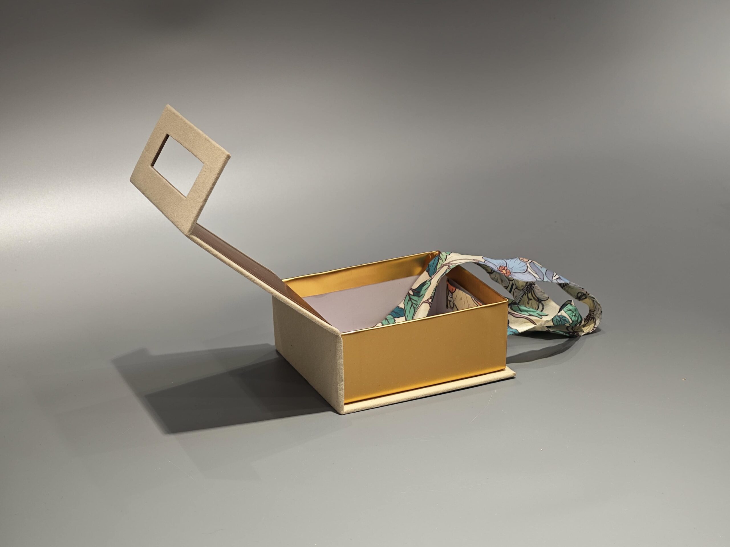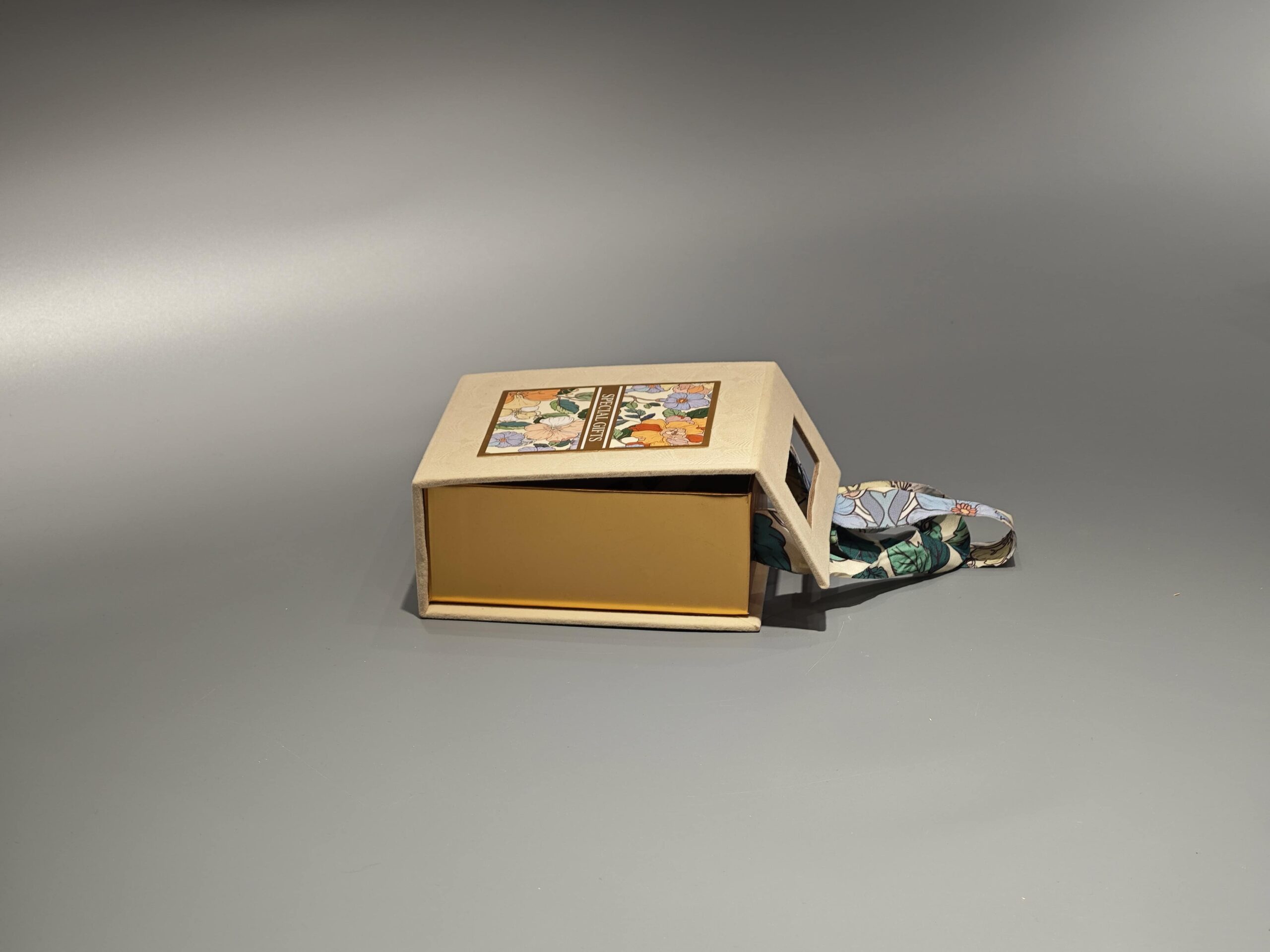 The Portable flip top gift box with ribbon is a beige box featuring a floral pattern, designed for the personal care industry. It includes an elegantly tied decorative ribbon at the top, enhancing its presentation as a gift packaging solution. The flip top design offers convenience and portability, suitable for various personal care products.
