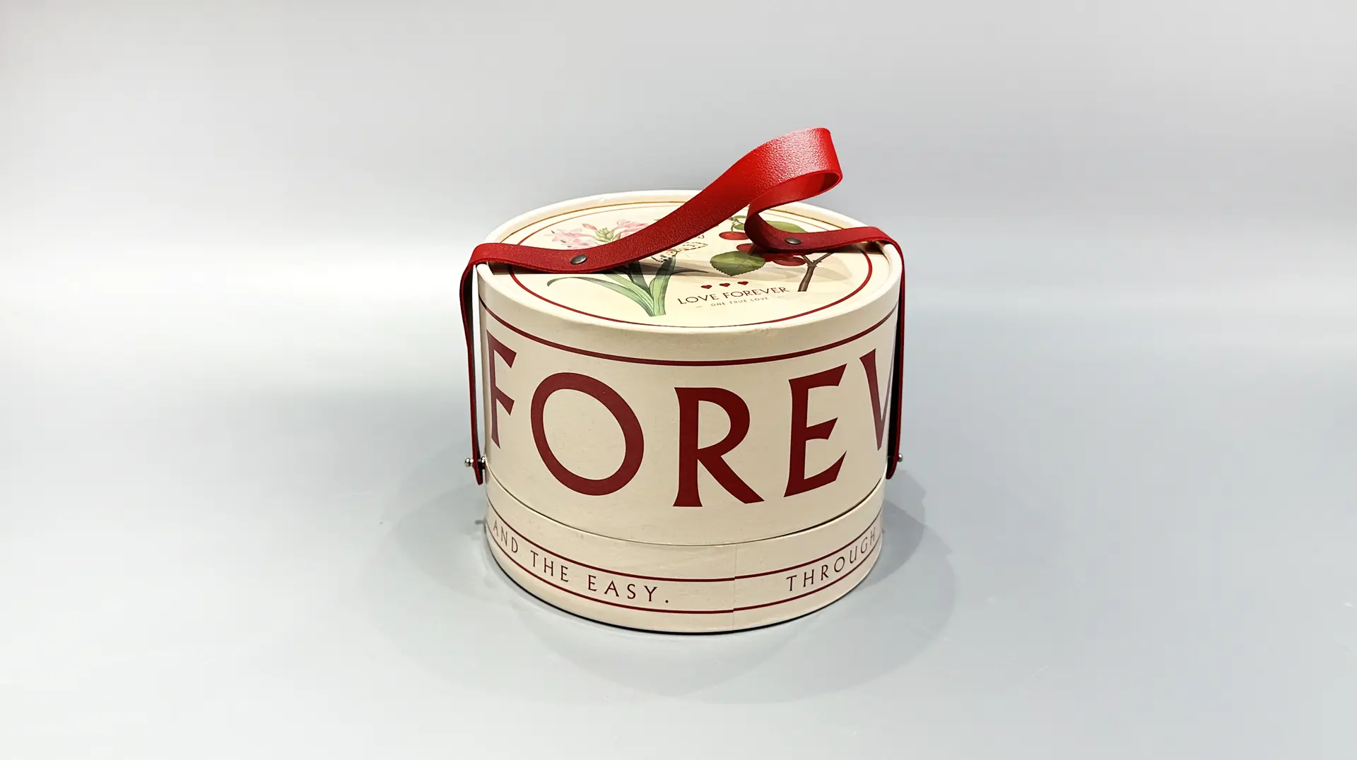 This round-shaped rigid box features a lift-off lid with a strap, suitable for elegant gift presentations. The two-piece telescope design offers durability and reusability, while its sturdy construction ensures protection for valuable contents.