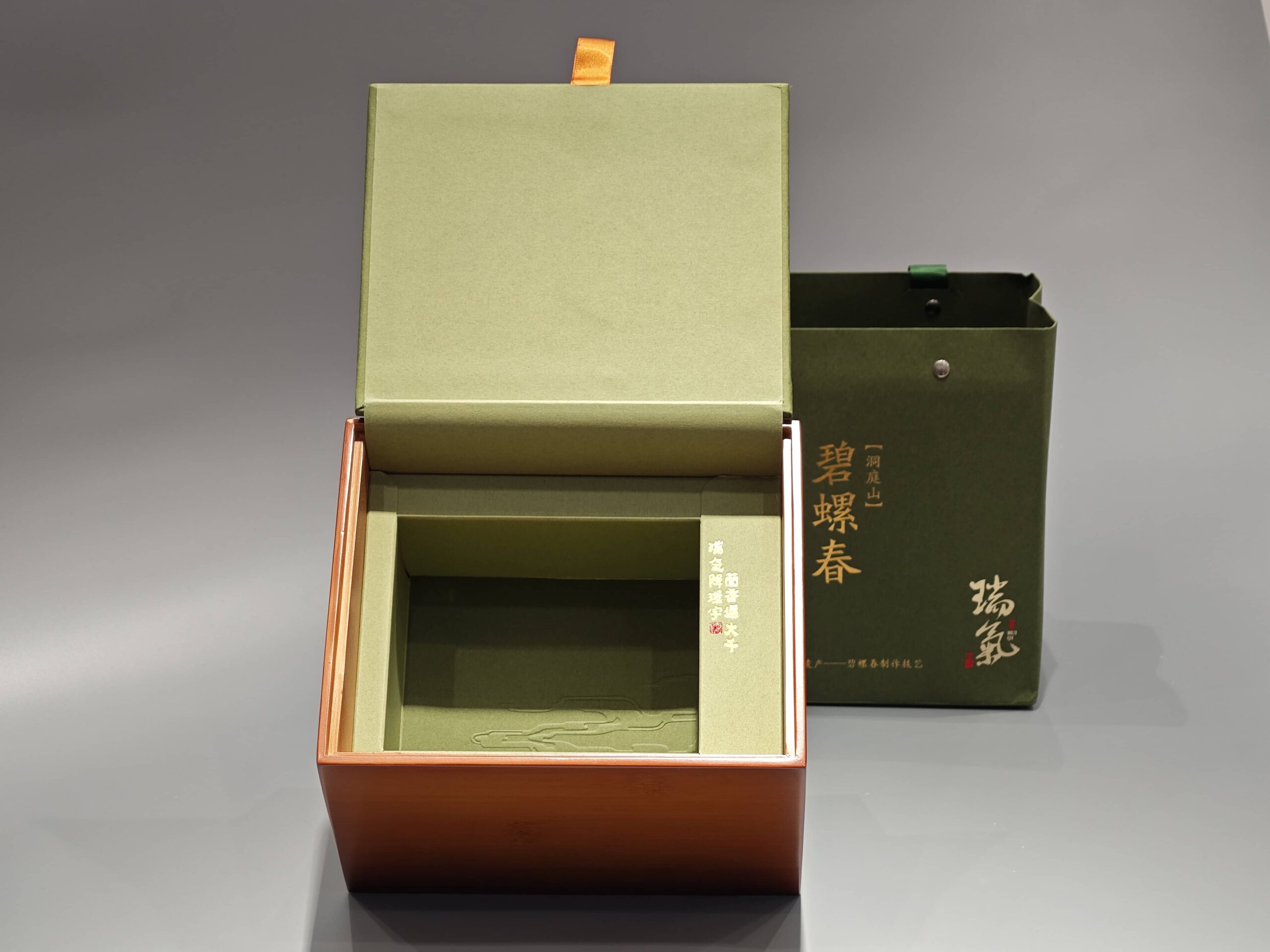 This custom wooden flip lid box features a luxurious design with gold and white elements, elegant Chinese characters, and a detailed dragon illustration. Originally designed for tea packaging, the box can be adapted for presenting contact lenses in a distinctive manner. Brand logos and quality stamps are prominently positioned, contributing to brand recognition in the eyecare industry.