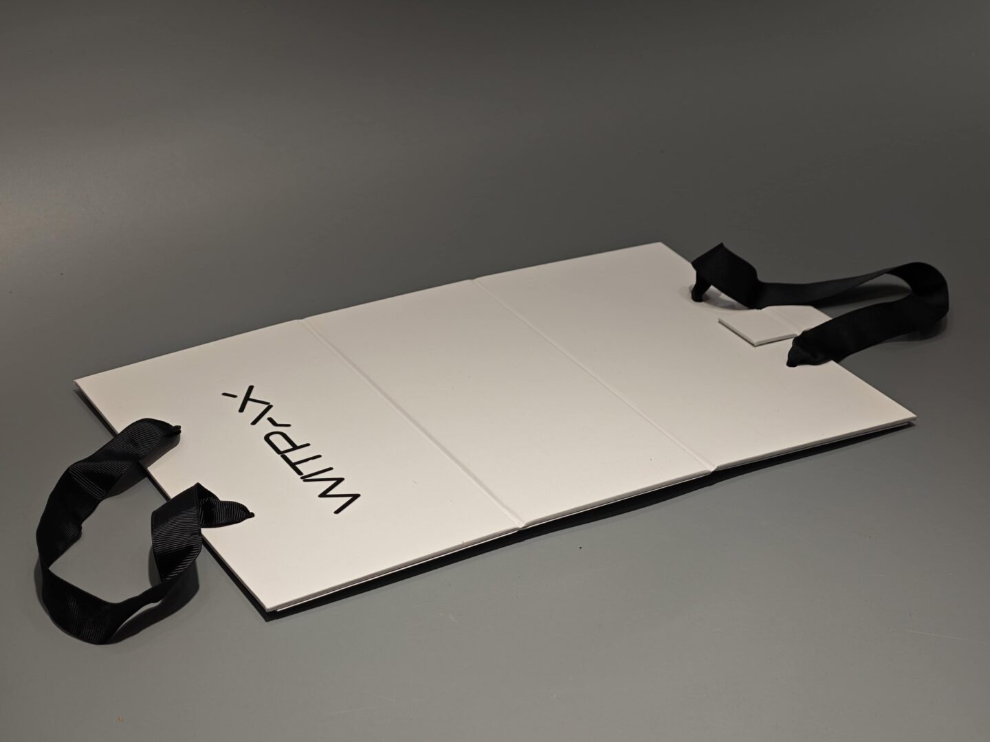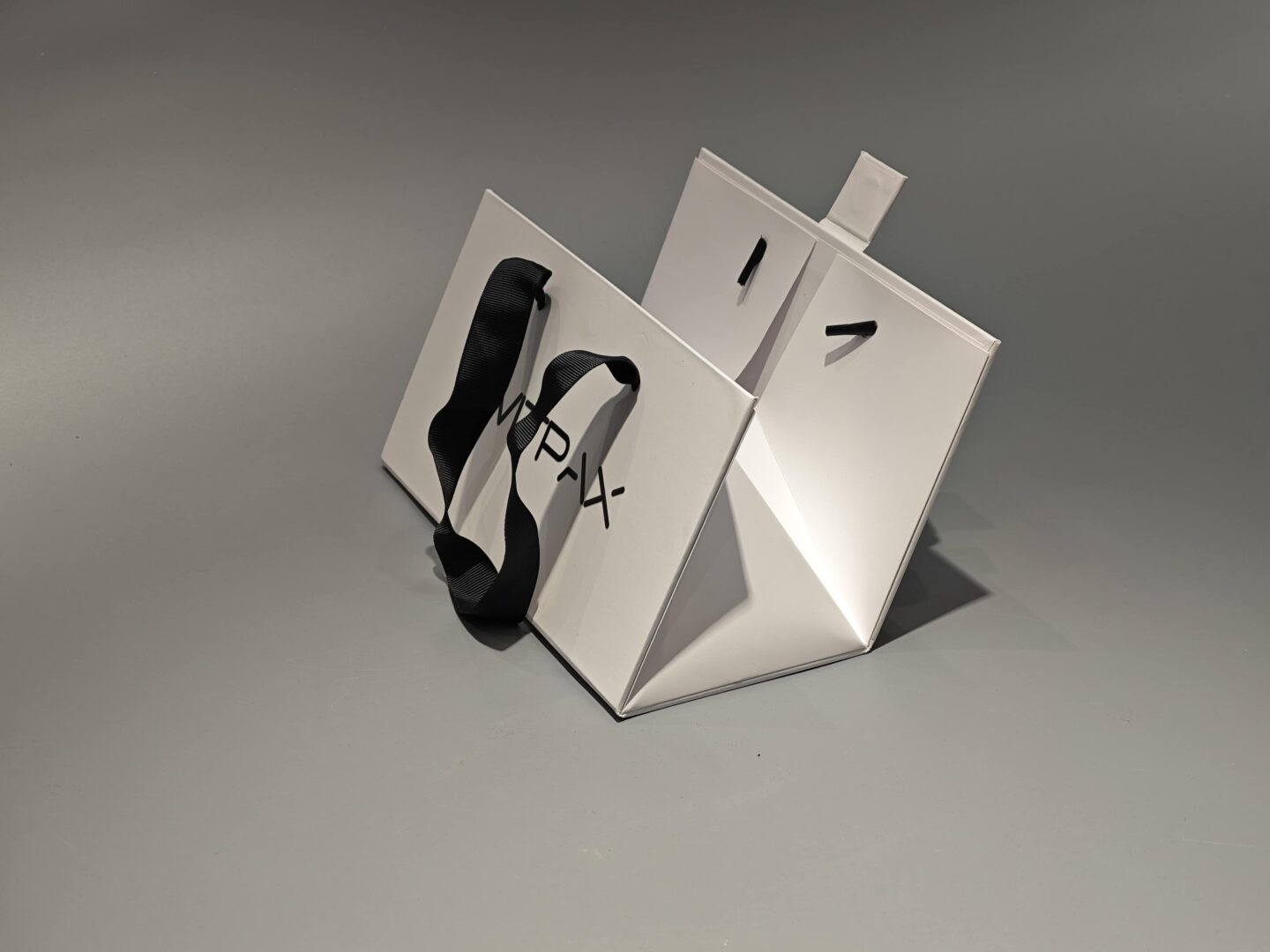 The Box is a unique triangular prism-shaped packaging solution that combines style and practicality. This collapsible rigid box features convenient straps, making it perfect for easy transport and storage while maintaining a sleek, high-end appearance.